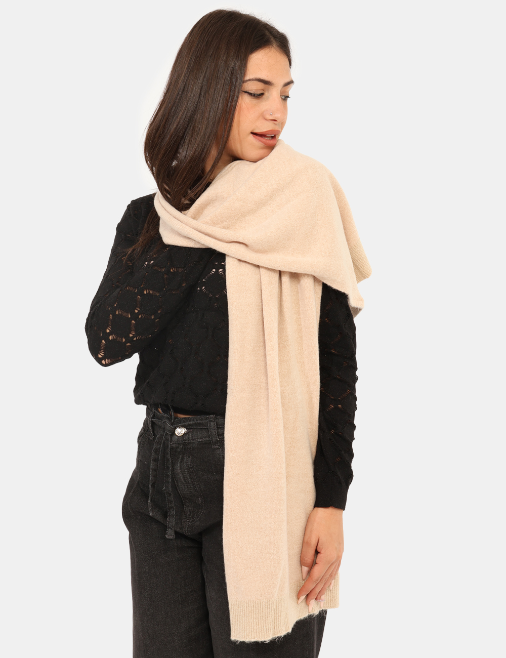 Sciarpa in total beige, calda e avvolgente, con filo lurex dorato che dona un tocco di luce all’accessorio. L’indossatura è morbida e pratica. Indossala per affrontare l’inverno con stile.