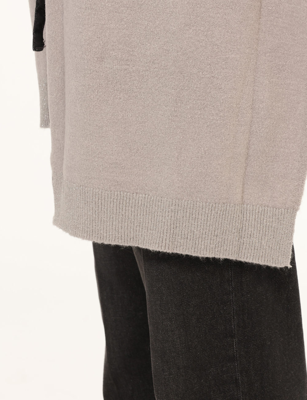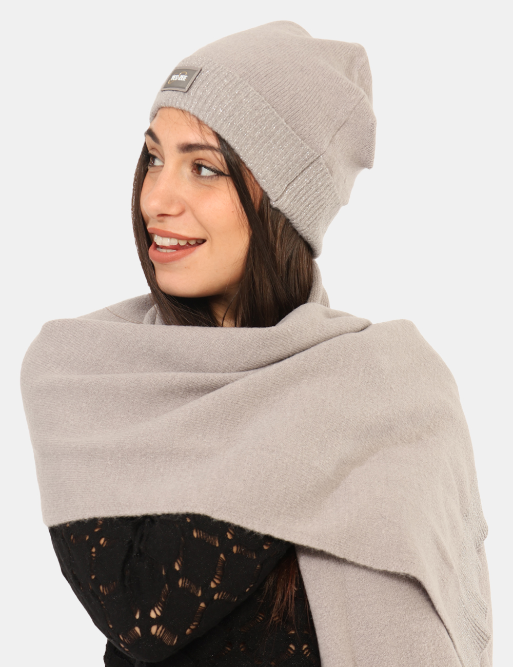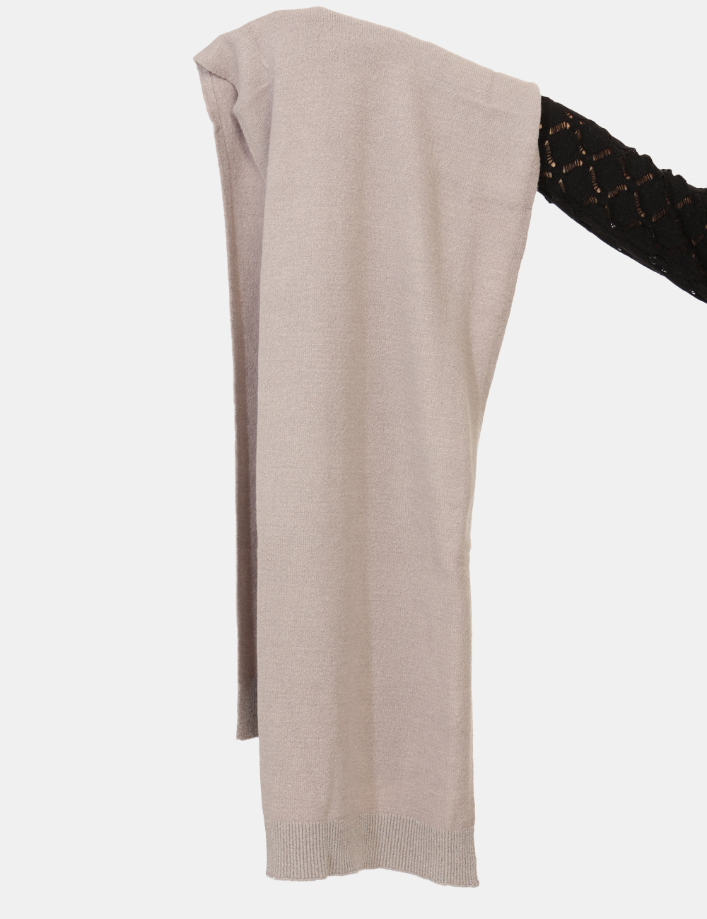 Sciarpa in total grigio perla, calda e avvolgente, con filo lurex dorato che dona un tocco di luce all’accessorio. L’indossatura è morbida e pratica. Indossala per affrontare l’inverno con stile.
