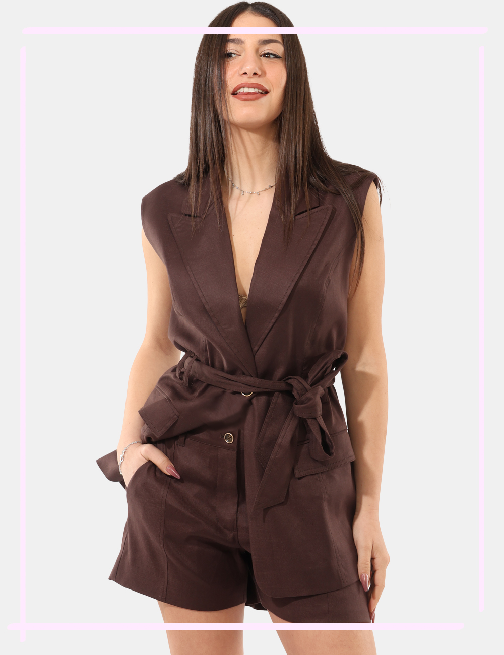 Perfetti da indossare per un aperitivo, una passeggiata in città o un’uscita nel tempo libero, questi shorts si adattano facilmente a diverse occasioni. Puoi abbinarli al gilet coordinato per un look sofisticato e armonioso, oppure scegliere sandali e un top leggero per un outfit estivo fresco e rilassato. Grazie alla loro linea equilibrata, sono ideali sia per il giorno che per momenti più informali della sera.