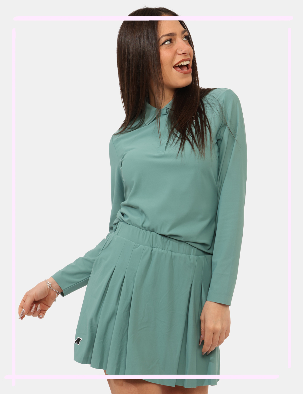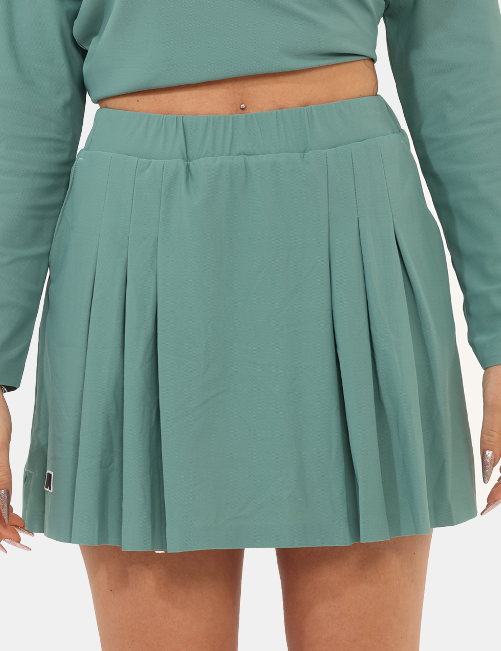 Realizzati in 88% poliamide e 12% elastane, assicurano elasticità, vestibilità confortevole e libertà di movimento. Shorts con volant simil gonna, in total verde, tasche, elastico in girovita, dettagli pratici che li rendono versatili e funzionali. La modella è alta 165 cm e indossa la taglia S; la vestibilità è regolare e valorizza la silhouette senza costringere. Pezzo unico di campionario.