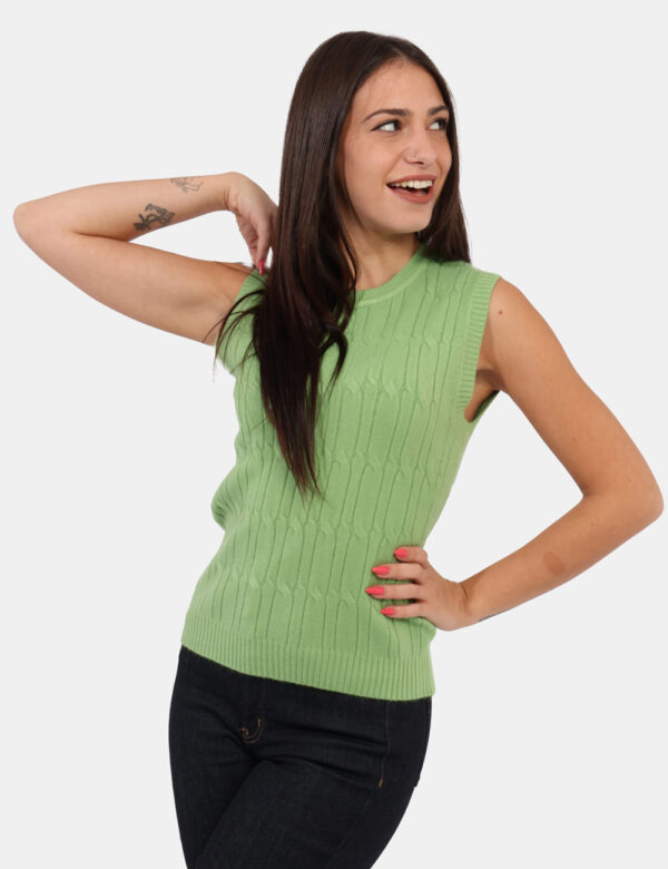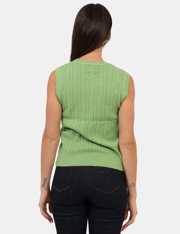 Maglia smanicata in total verde acido con trama intrecciata. La vestibilità è morbida e regolare. Il gilet è adatto per occasioni casual e facilmente combinabile. Dona un tocco fashion ai tuoi outfit.