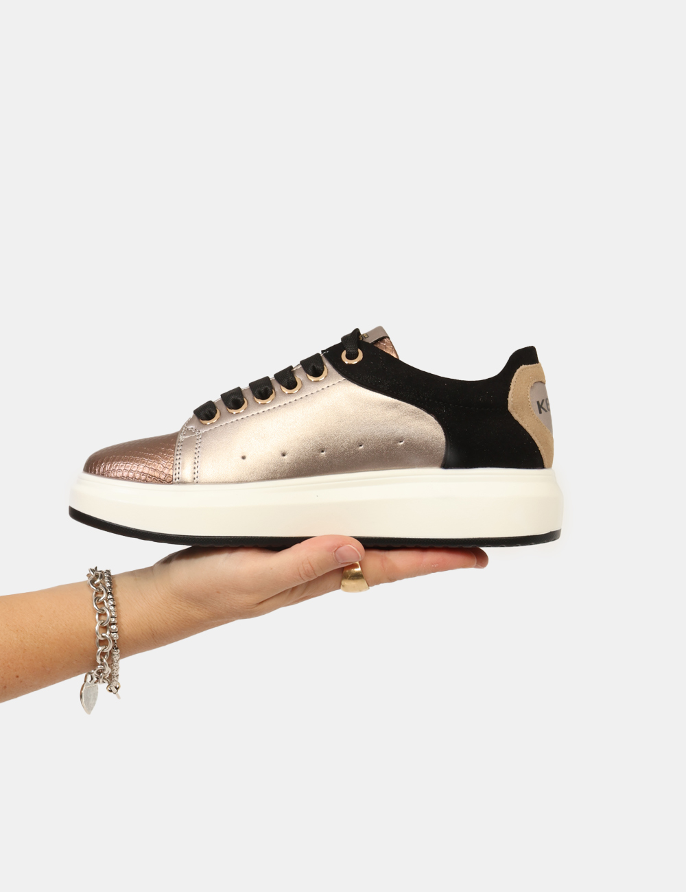 Sneakers in tessuto e cuoio total bronze con dettagli neri. L’indossatura è pratica e confortevole anche grazie a lacci in tinta. Con queste scarpe sarai sempre a tuo agio.