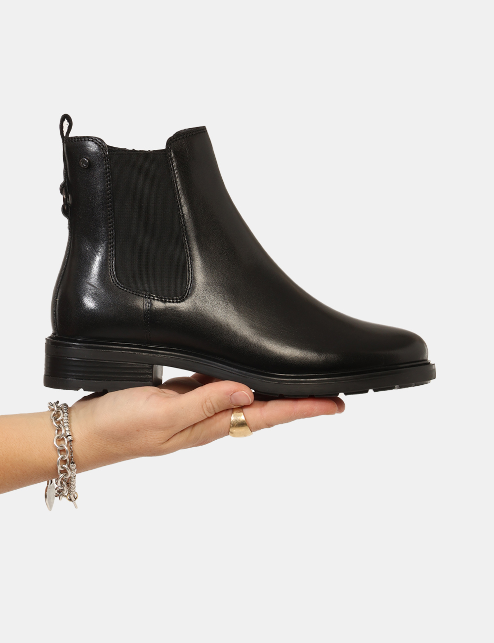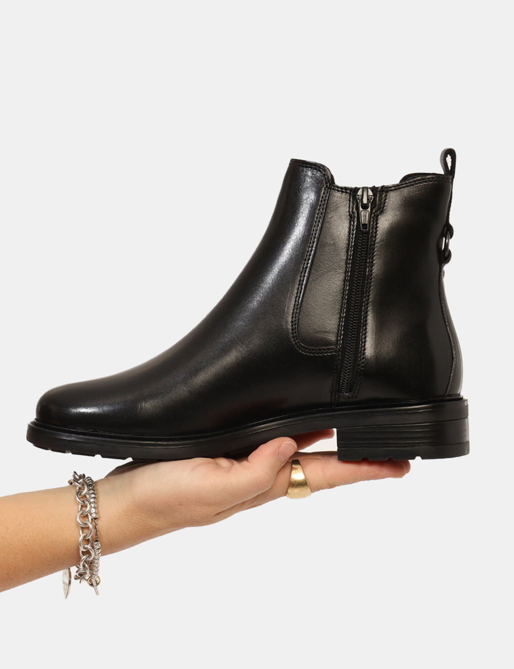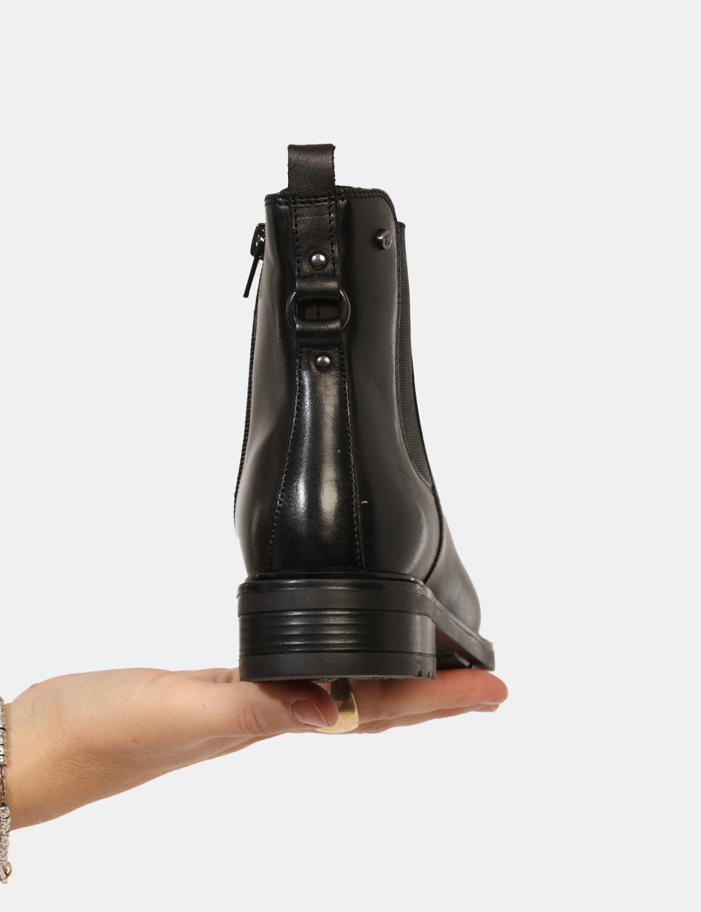 Elegante stivaletto in cuoio total nero, con tacco basso e largo, inserto in tessuto elastico e zip laterale che permette un’indossatura pratica e confortevole. Gli stivaletti sono ideali per il giorno e per l’ufficio, perfettamente combinabili con numerosi outfit. Indossali per essere sempre a tuo agio.