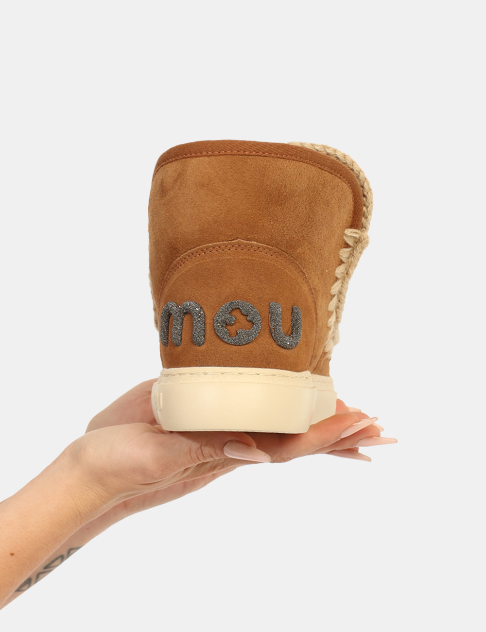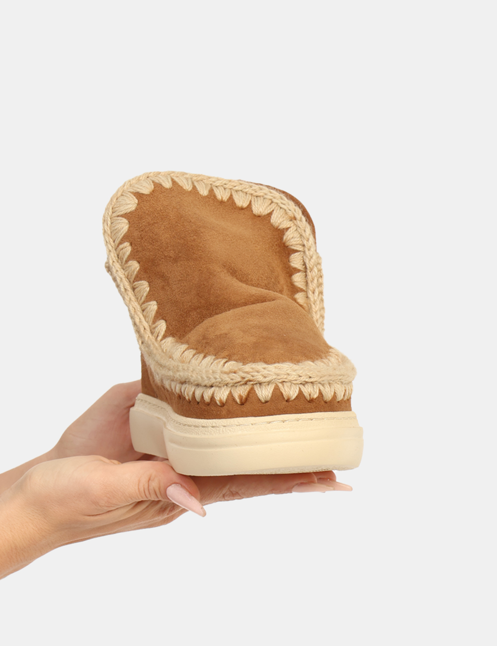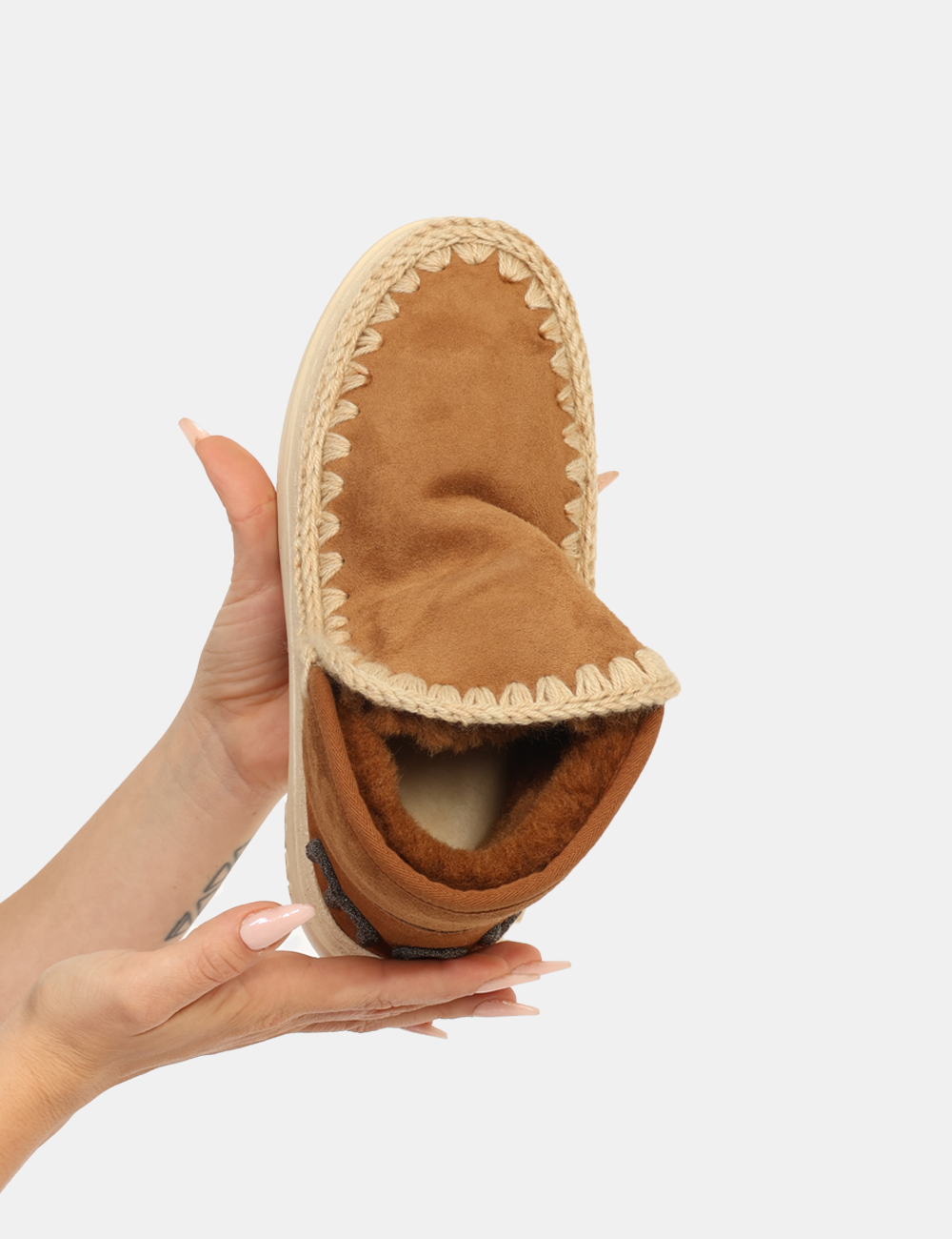 Stivaletti in misto lana, tessuto scamosciato marrone chiaro con dettagli in corda ed interno caldo in fake fur abbinato. Presente logo brand glitterato in rilievo. L’indossatura è morbida e avvolgente, super comoda anche grazie alla suola rialzata. Gli stivaletti sono adatti per occasioni casual, ideali per l’inverno. Affronta la stagione più fredda con stile e morbidezza.