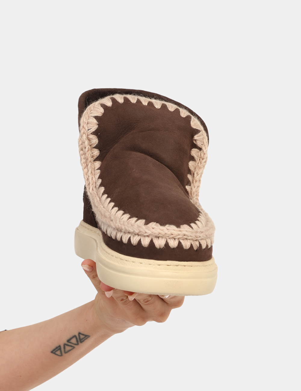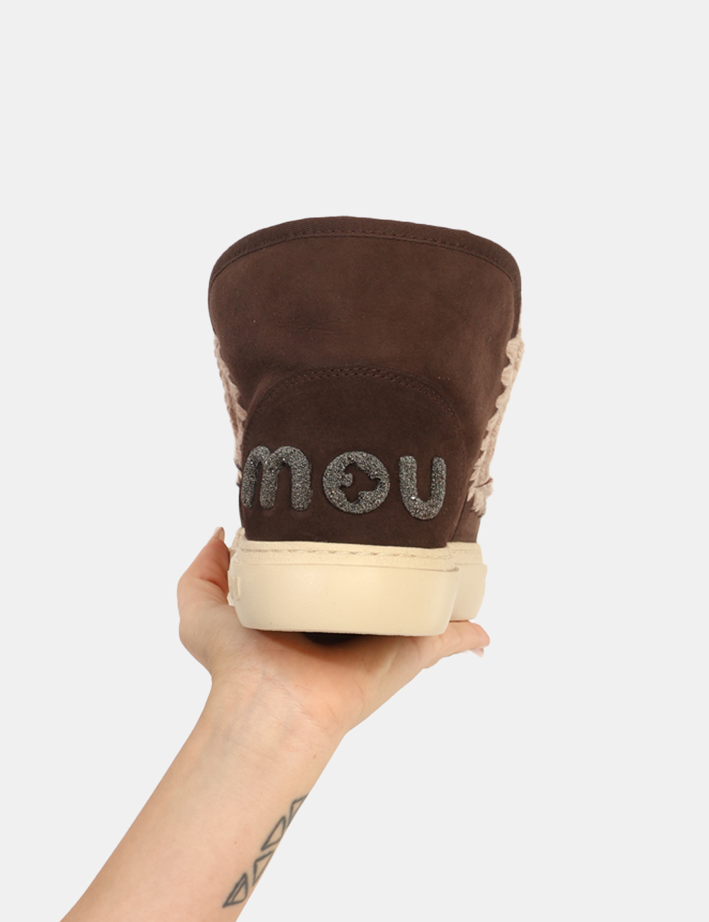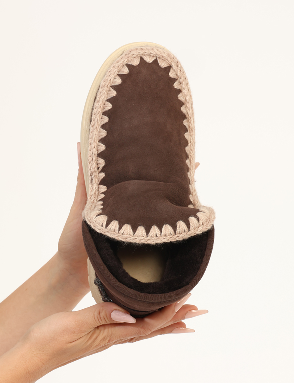 Stivaletti in misto lana, tessuto scamosciato marrone con dettagli in corda ed interno caldo in fake fur abbinato. Presente logo brand glitterato in rilievo. L’indossatura è morbida e avvolgente, super comoda anche grazie alla suola rialzata. Gli stivaletti sono adatti per occasioni casual, ideali per l’inverno. Affronta la stagione più fredda con stile e morbidezza.