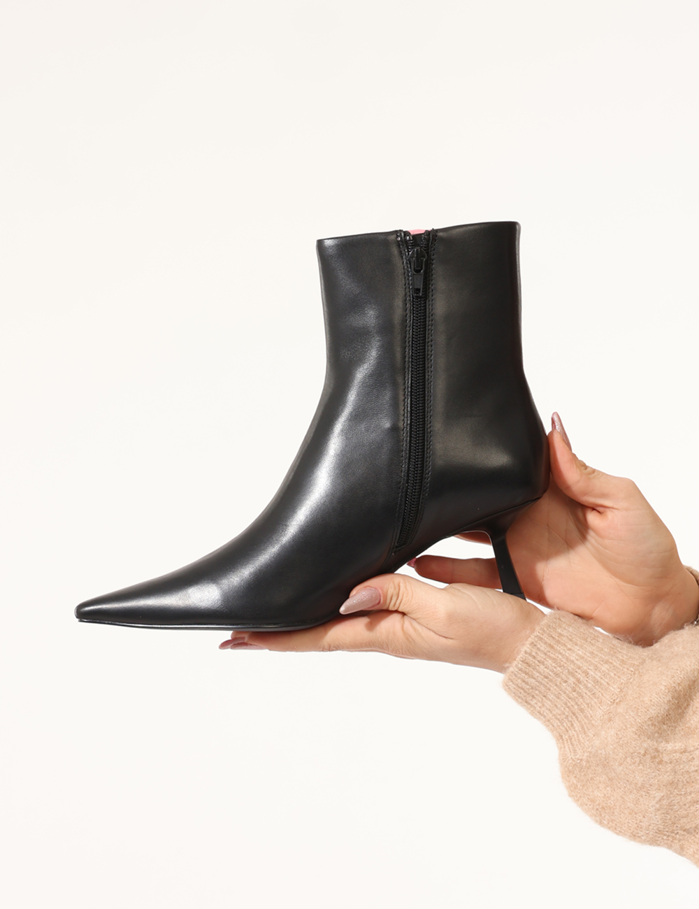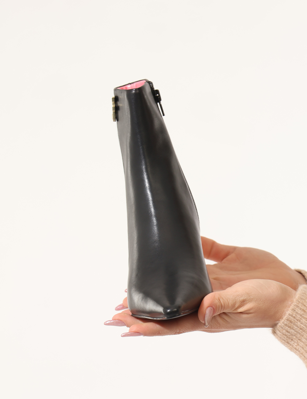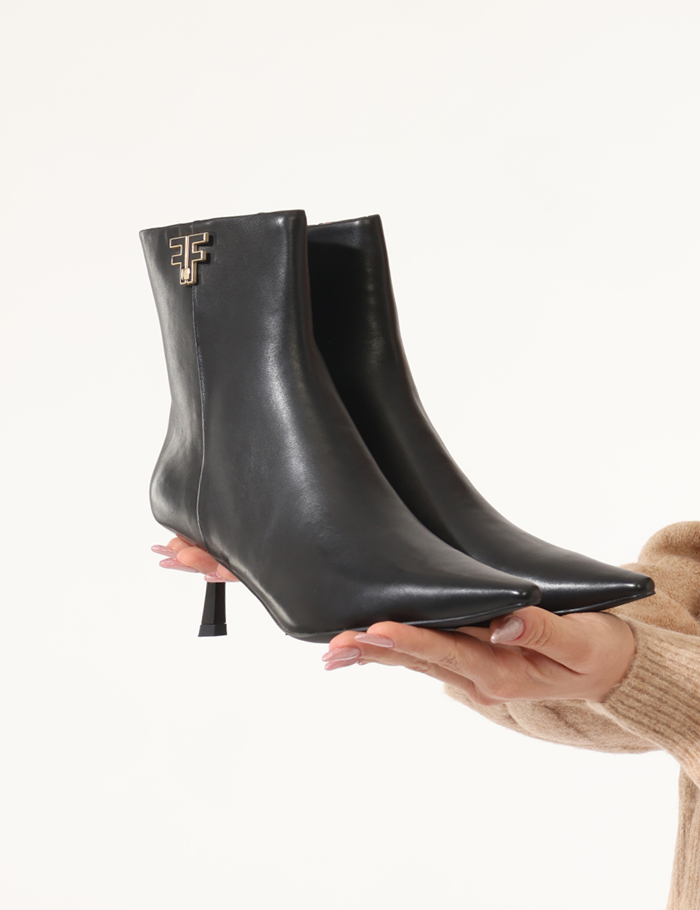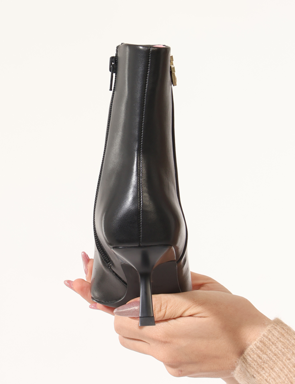 Tronchetto con tacco basso e dettaglio dorato.