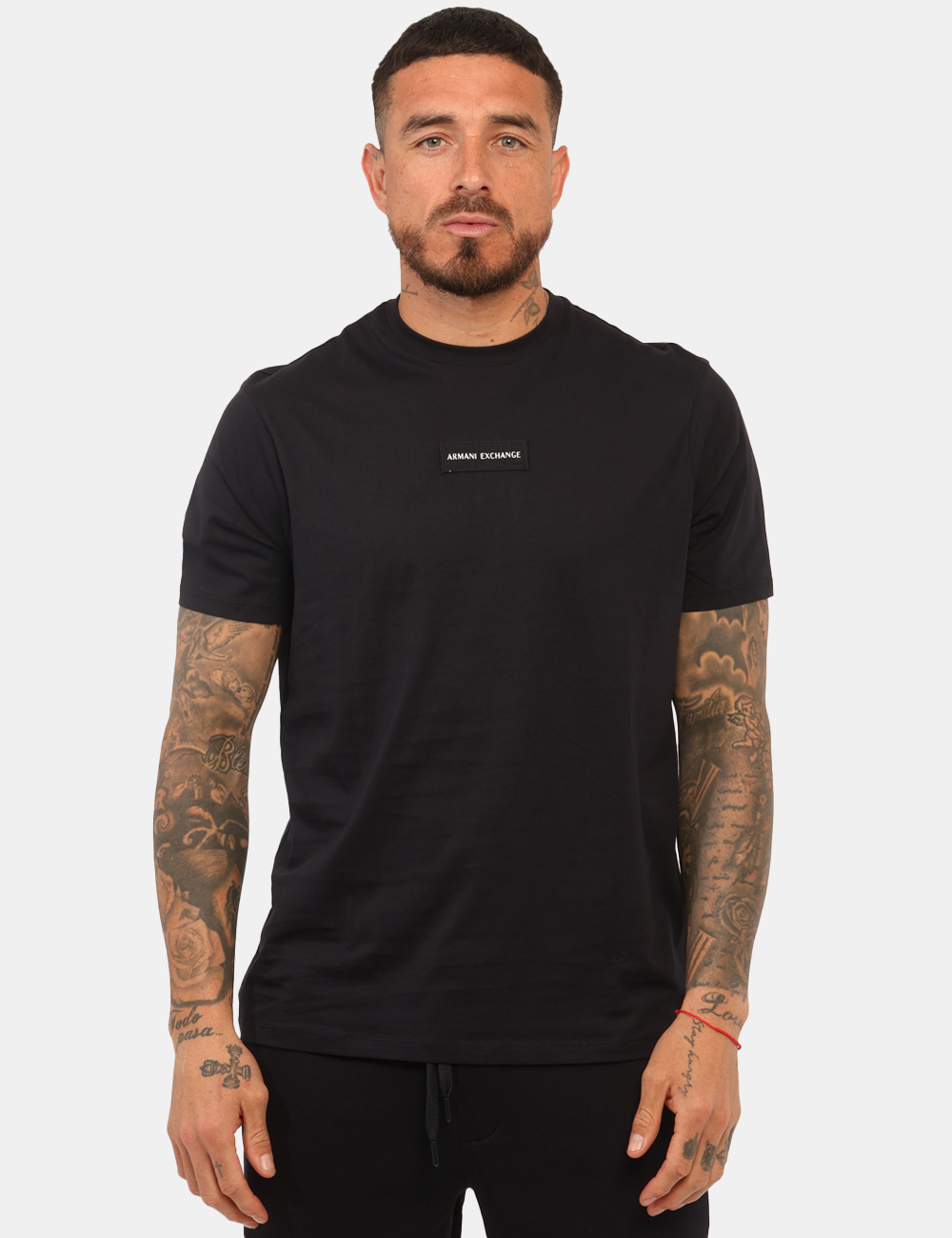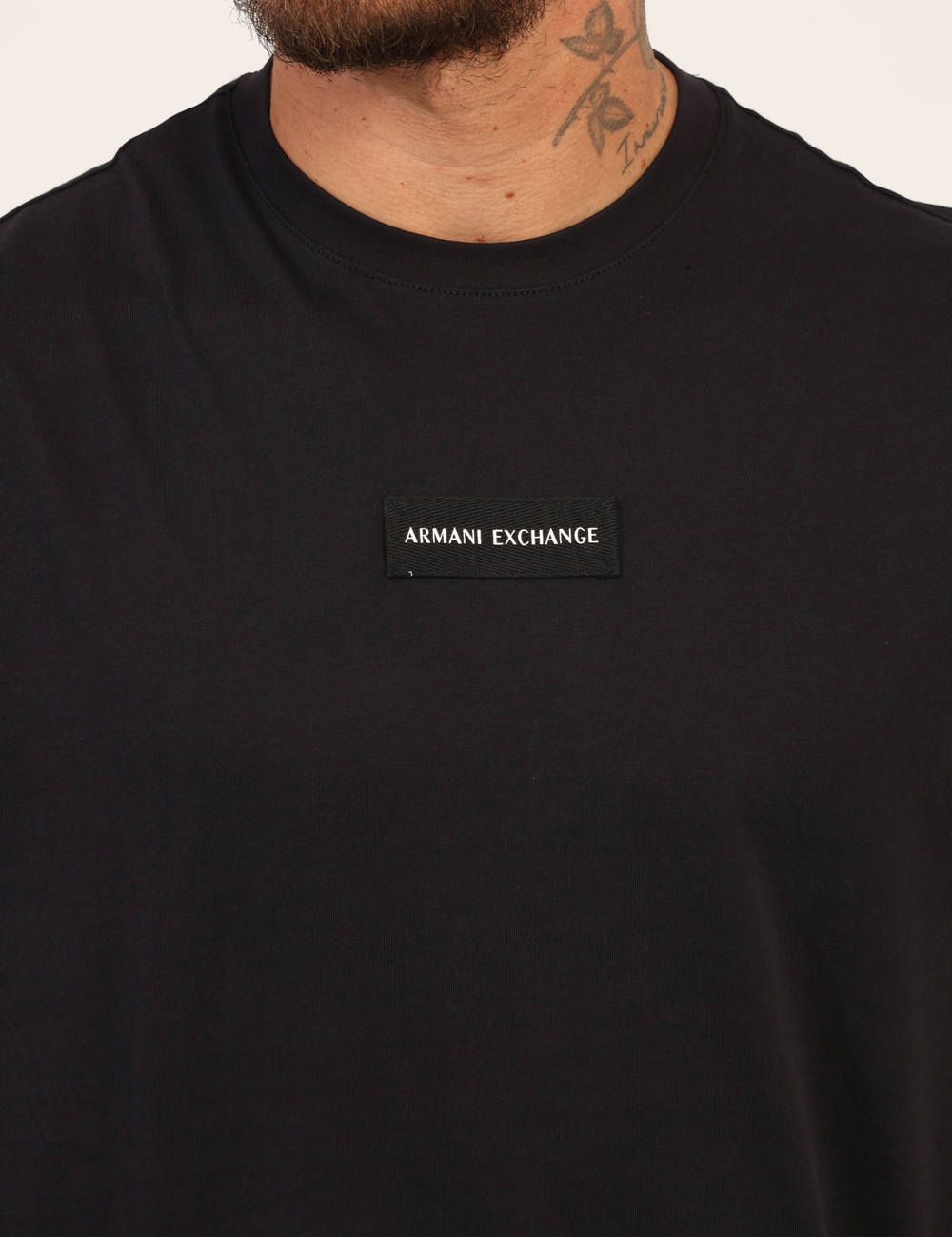 Il dettaglio distintivo è la toppa con brand Armani Exchange, un elemento grafico discreto che aggiunge personalità al capo senza rinunciare allo stile minimal. Questo particolare rende la t-shirt facilmente riconoscibile e valorizza l’identità contemporanea del brand.