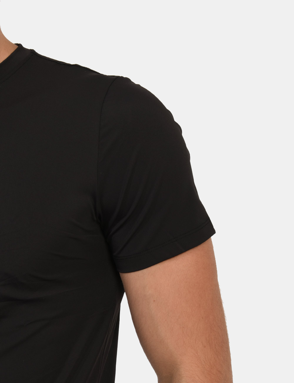 T-shirt classica in total nero ed in tessuto lucido. Presente girocollo regolare. La vestibilità è slim. La t-shirt è adatta per occasioni casual e facilmente combinabile. Praticità e stile in un solo capo.
