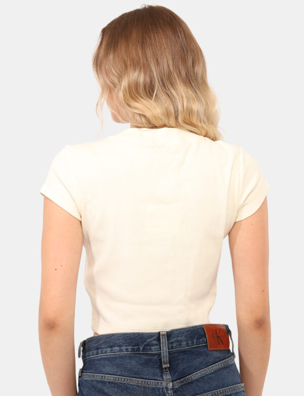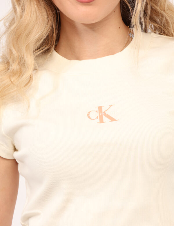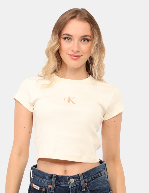 T-shirt corta, costina, in total beige con stampa logo brand coordinata. La vestibilità è morbida e regolare. La t-shirt è adatta per occasioni casual e facilmente combinabile. Praticità e stile in un solo capo.