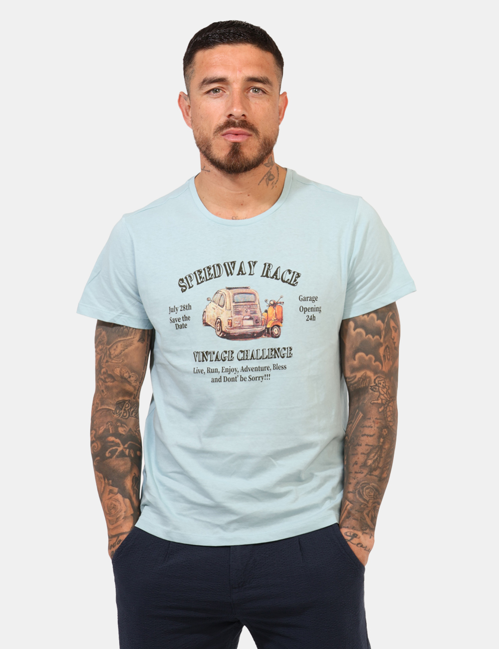 T-shirt classica su base azzuro chiaro con colorata stampa “Speedway”. La vestibilità è morbida e regolare. La t-shirt è adatta per occasioni casual e facilmente combinabile. Il tuo prossimo articolo nei prodotti salvati.