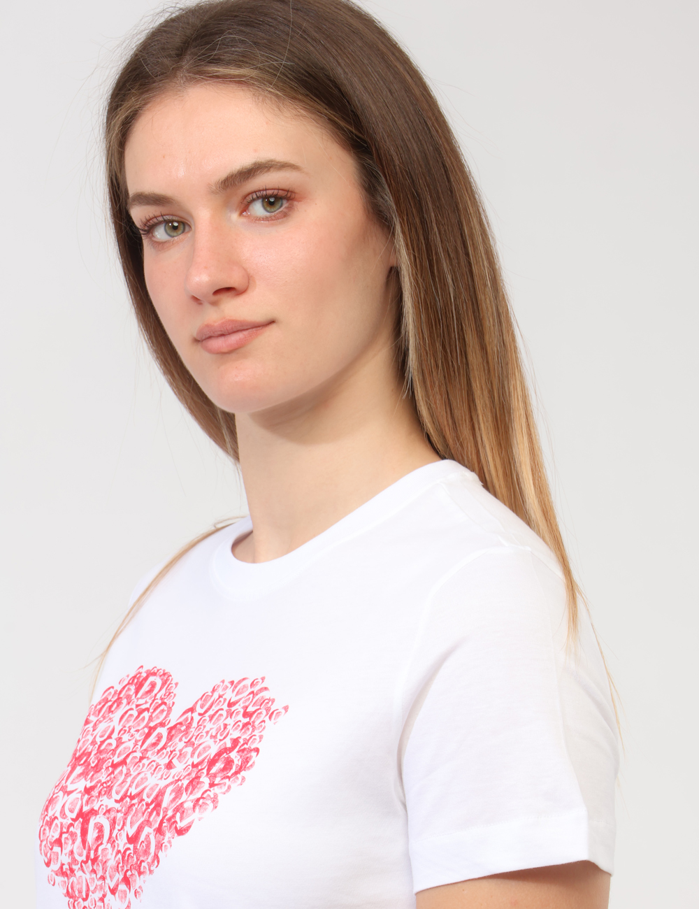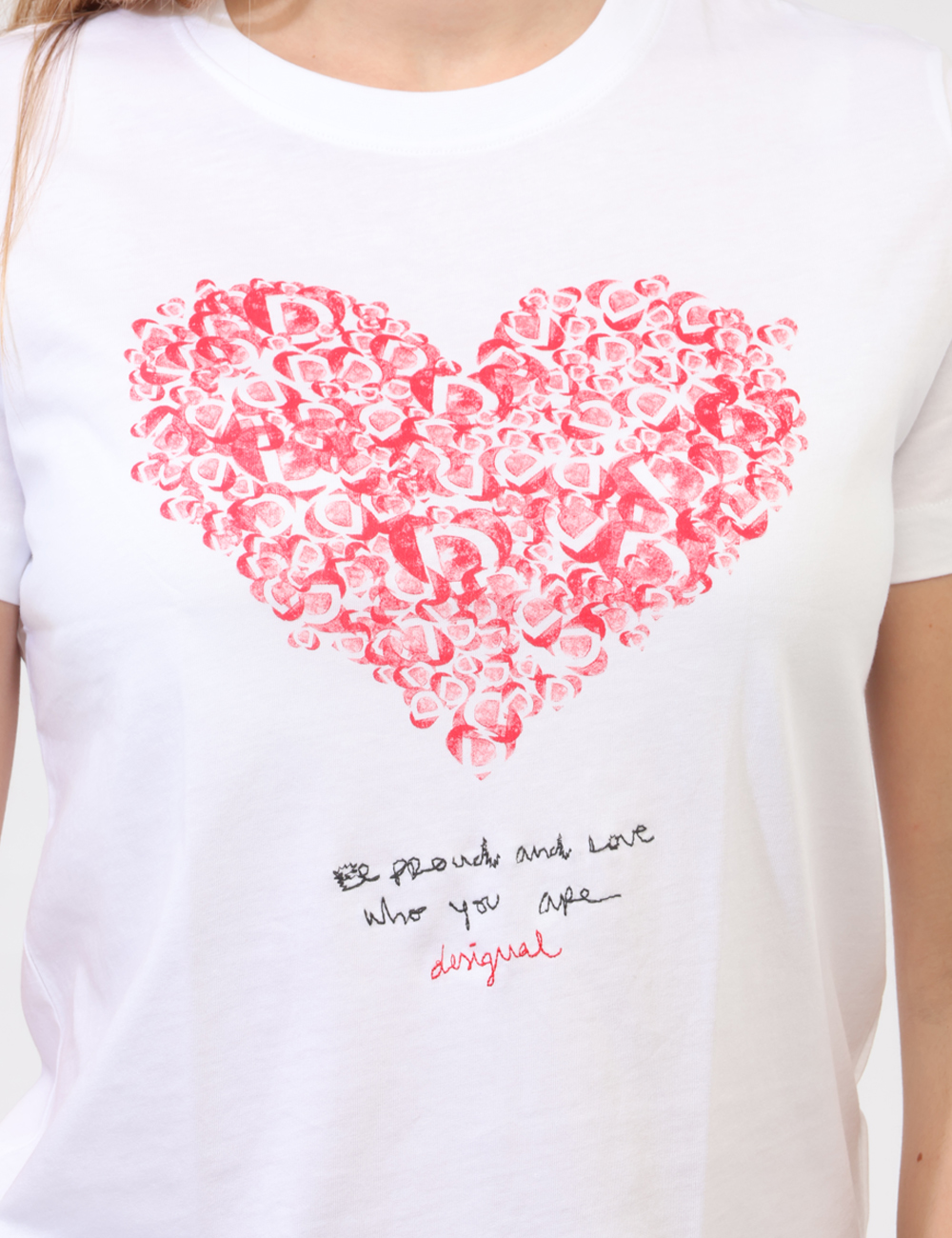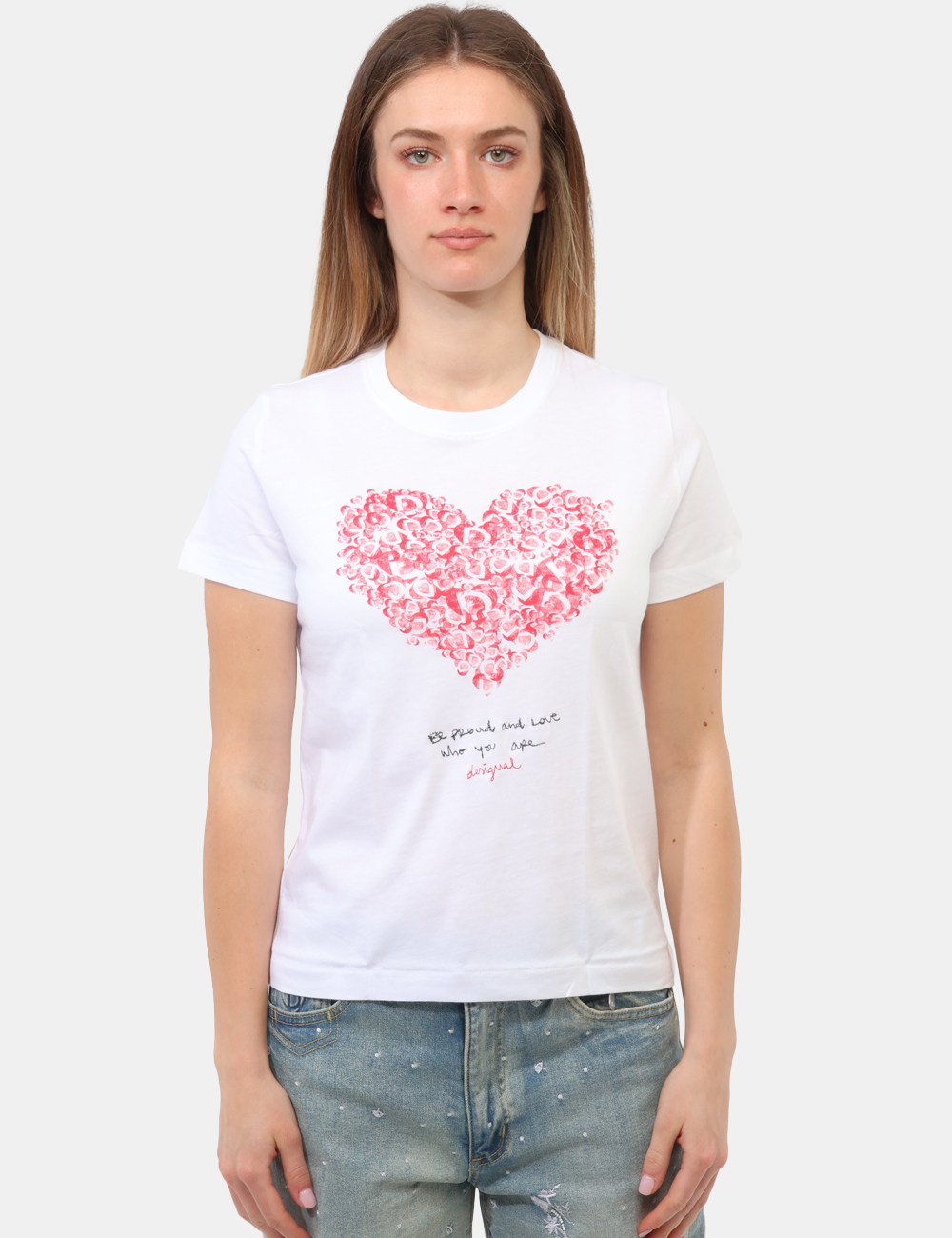 Il dettaglio della stampa a cuore unito alla scritta ricamata a contrasto dona personalità e un tocco romantico, rendendo questa T-shirt con stampa a cuore e scritta ricamata a contrasto perfetta per chi cerca un capo essenziale ma non banale.