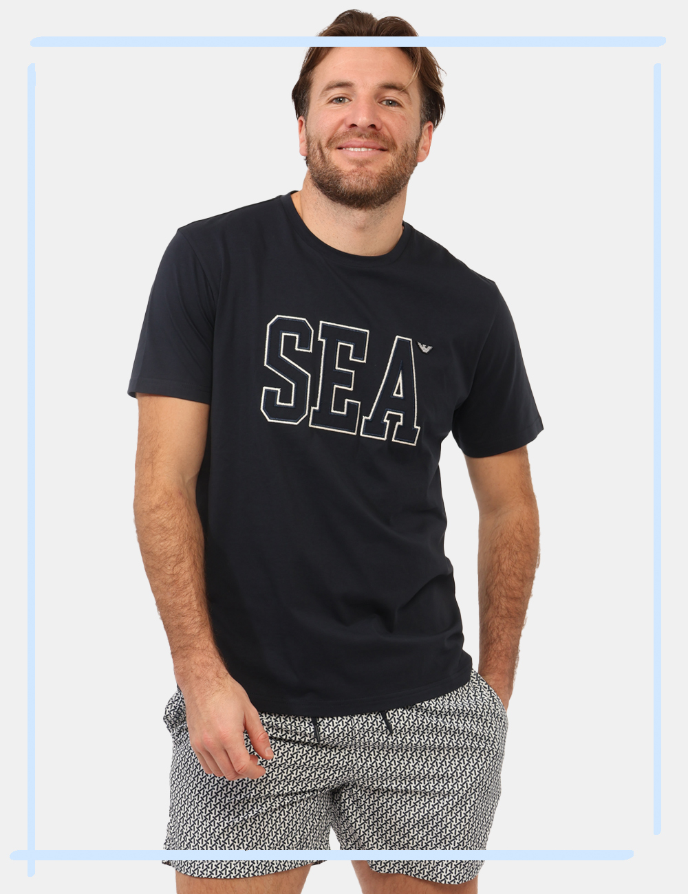 Il design si distingue per la stampa ricamata bianca e il patch logo brand, dettagli che valorizzano il blu intenso del tessuto creando un contrasto elegante e moderno. La vestibilità è regolare: il modello è alto 187 cm e indossa la taglia L. Si tratta di un pezzo unico di campionario, selezionato con cura per offrire esclusività e qualità.