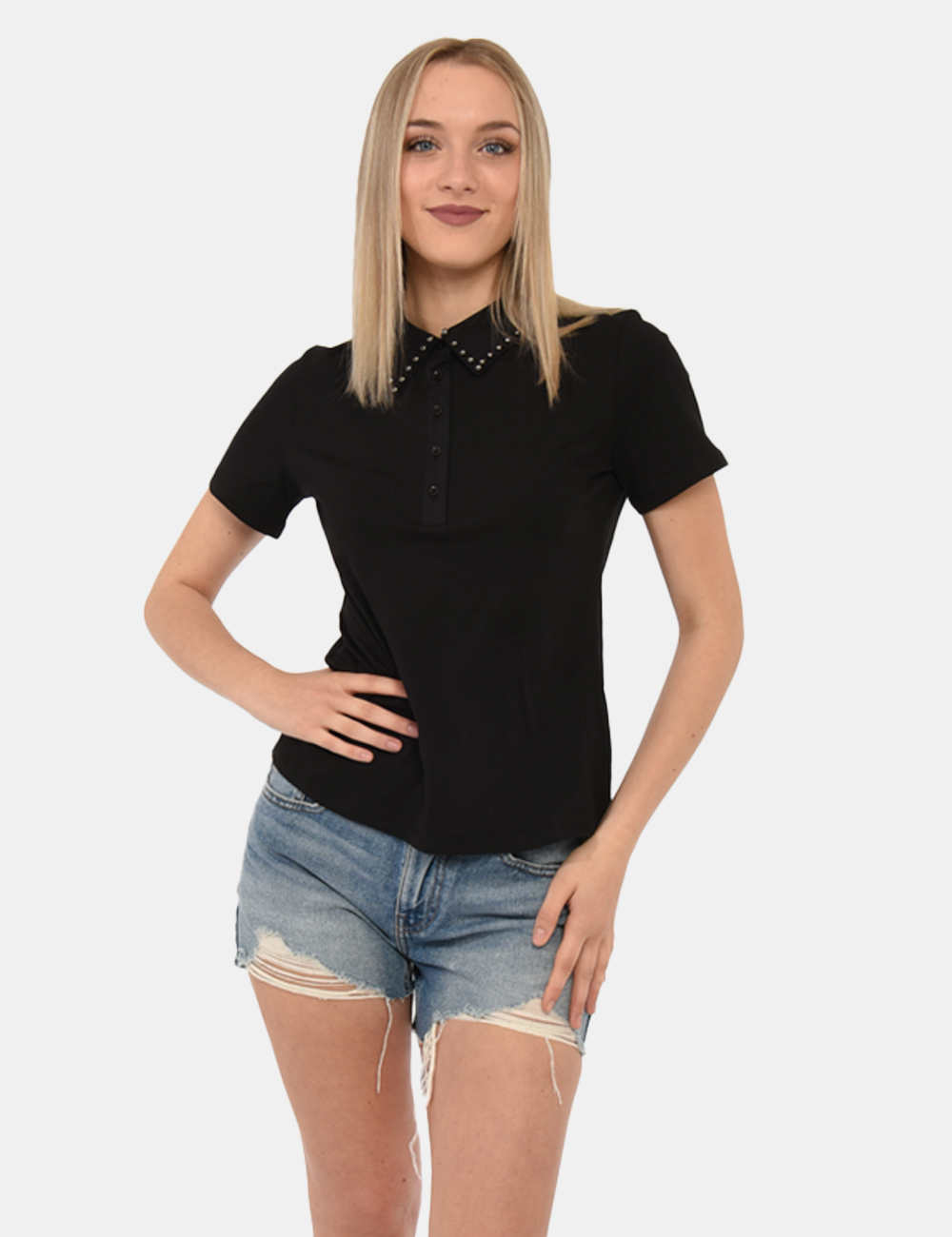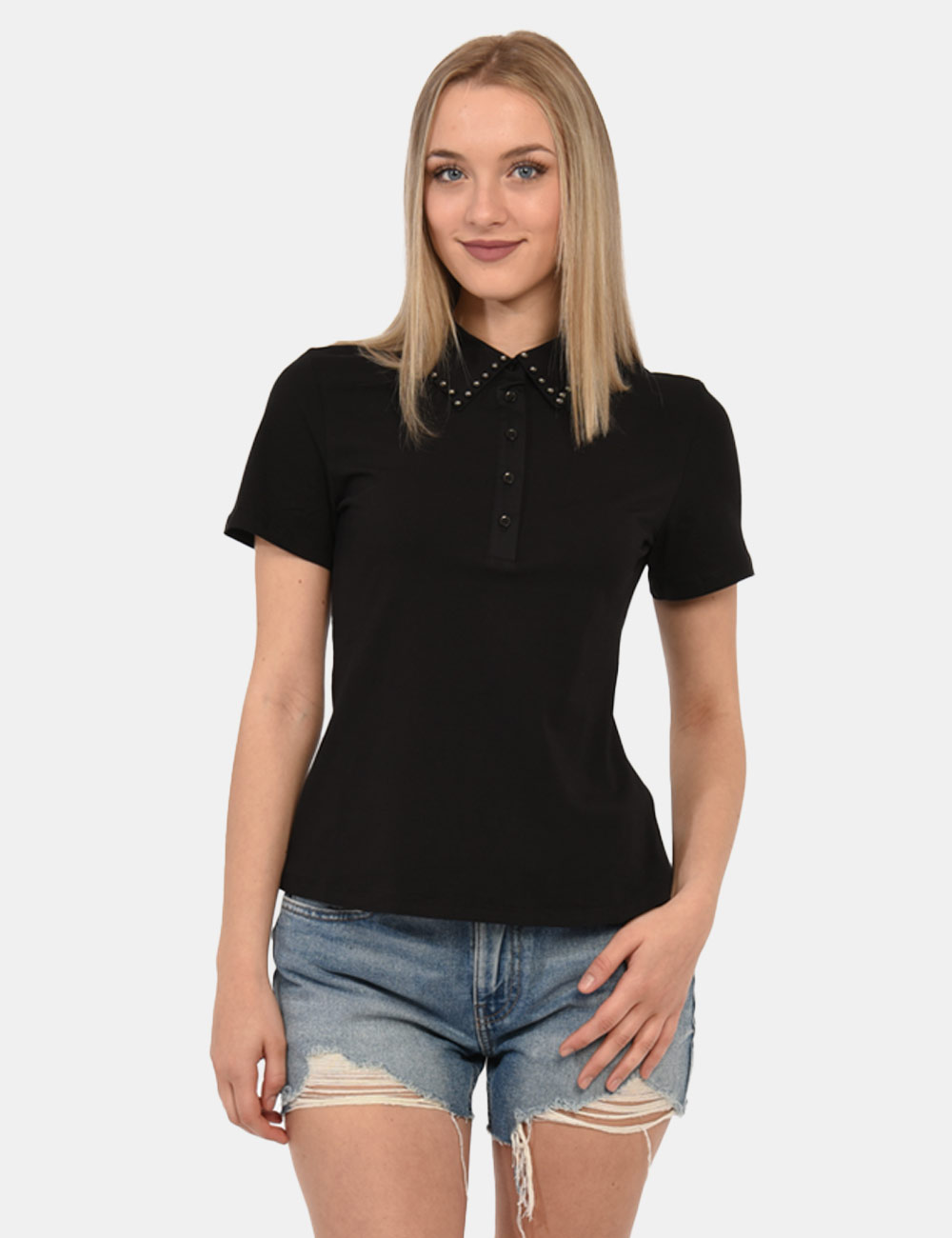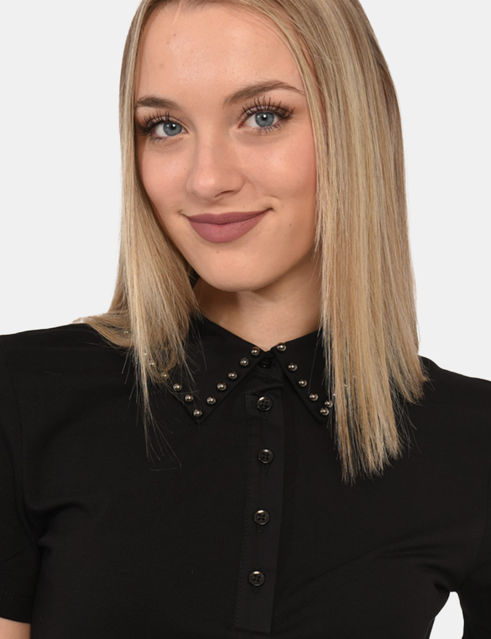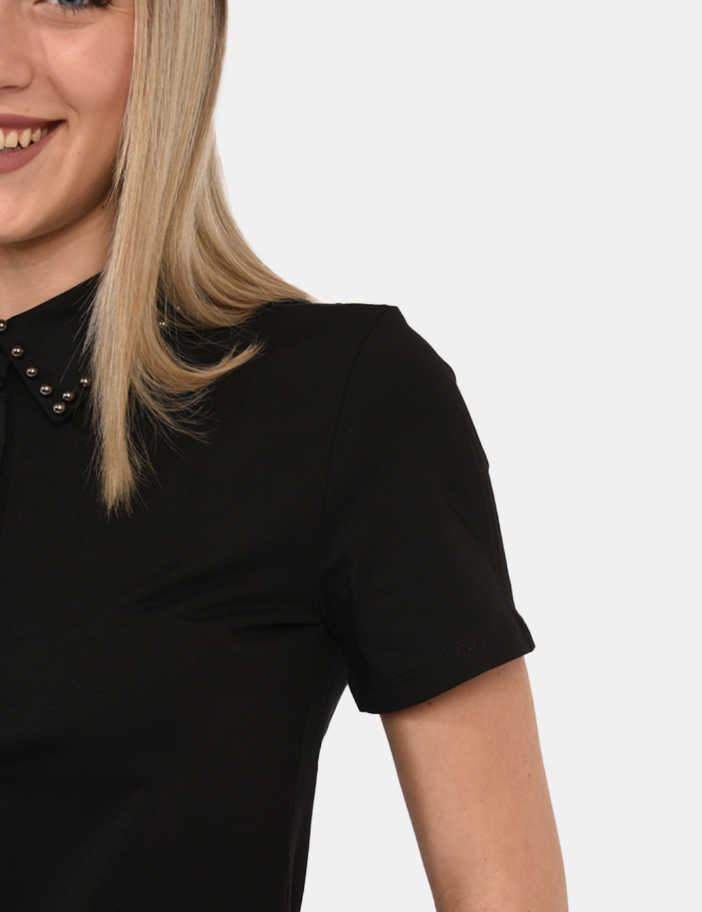 T-shirt simil polo in total nero con colletto alla peter pan arricchito da perle coordinate. La vestibilità è morbida e pratica grazie a bottoni ad asola in tinta. La t-shirt è adatta per occasioni casual e facilmente combinabile. Praticità e stile in un solo capo.