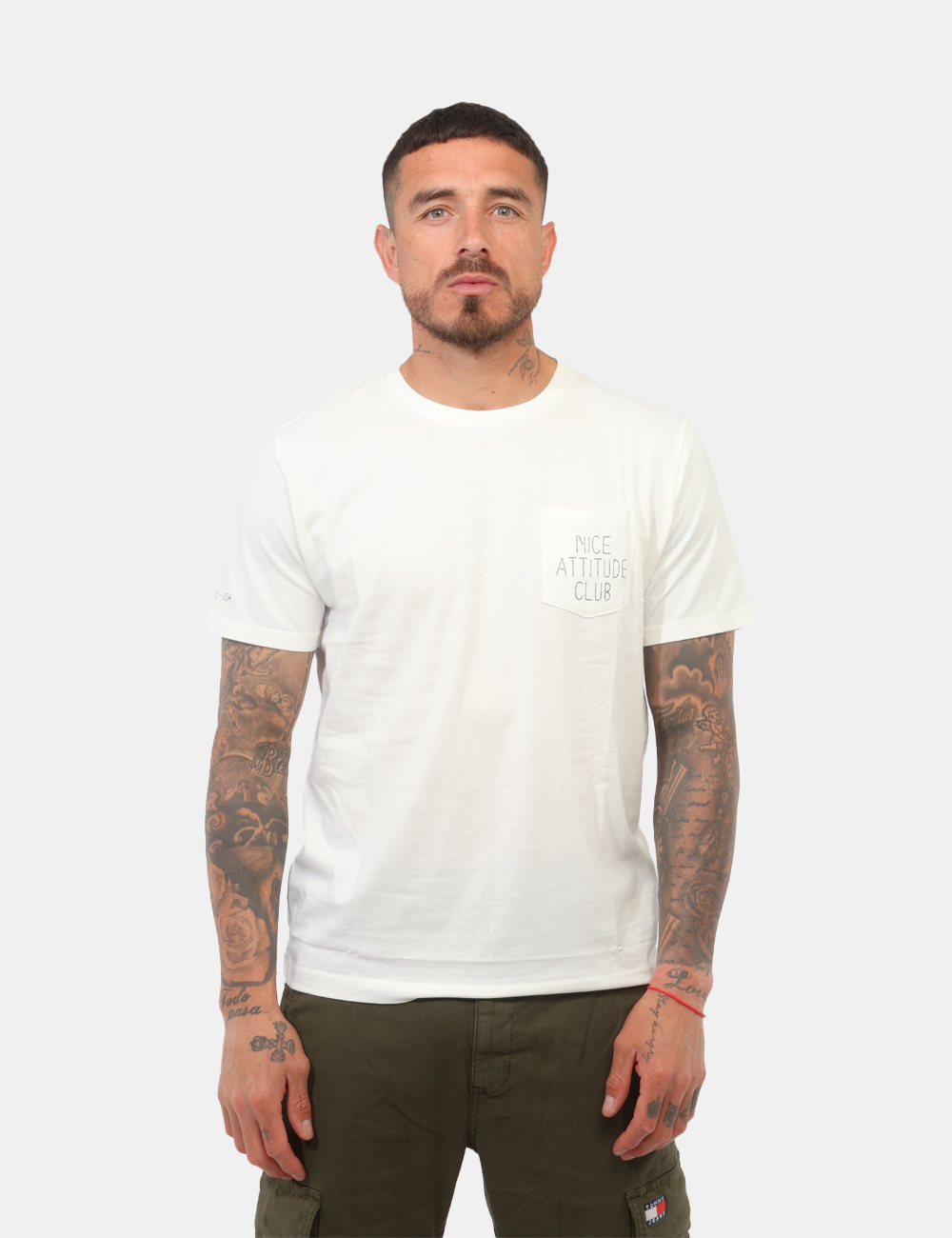 Questa T-shirt da uomo adatta in tutte le stagioni si distingue per i dettagli che fanno la differenza: il taschino sul petto aggiunge un tocco casual e contemporaneo, mentre il ricamo a contrasto dona carattere al capo senza risultare eccessivo. Il colore bianco, luminoso e sempre attuale, si abbina facilmente a qualsiasi look. La vestibilità regolare assicura un fit comodo e naturale: il modello è alto 187 cm e indossa una taglia L.