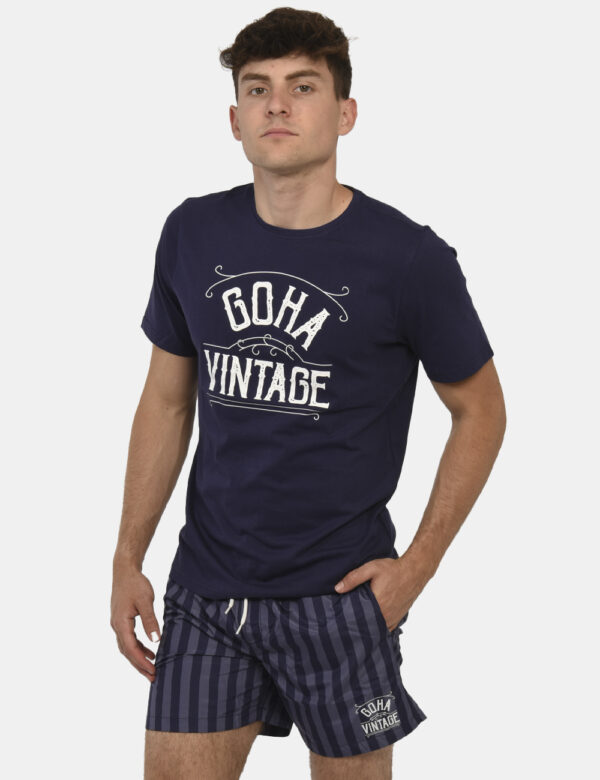 T-shirt classica su base blu navy con stampa centrale logo brand bianca. La vestibilità è morbida e regolare. La t-shirt è adatta per occasioni casual ma anche per la spiaggia. Praticità e stile in un solo capo.