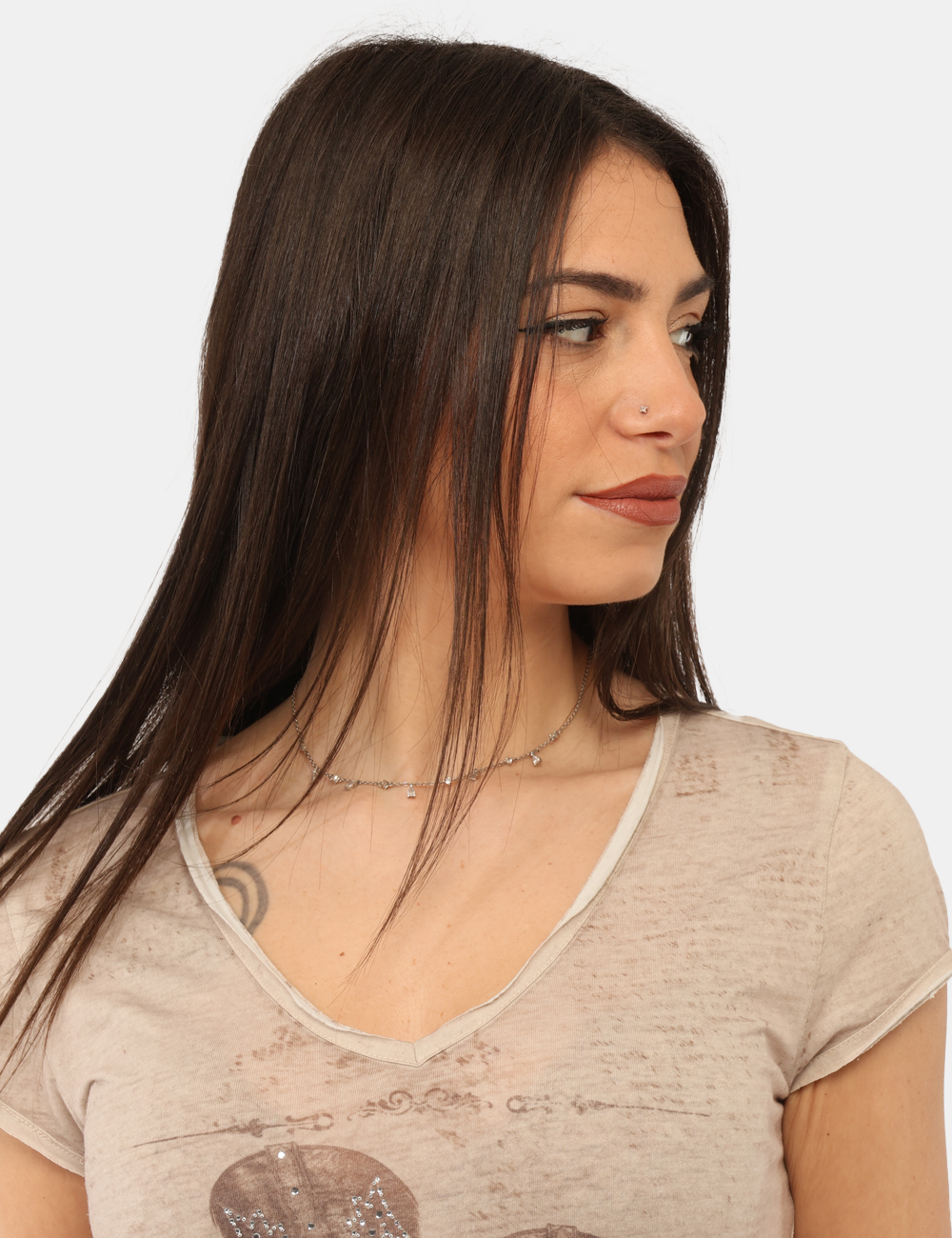 Il design si distingue per lo scollo a V, stampa coordinata e glitter, dettagli che aggiungono un tocco brillante e femminile senza risultare eccessivi. Lo scollo a V valorizza la linea del décolleté, mentre la vestibilità regolare assicura libertà di movimento e una silhouette armoniosa. La modella è alta 165 cm e indossa la taglia S, un riferimento utile per orientarti nella scelta della misura più adatta.