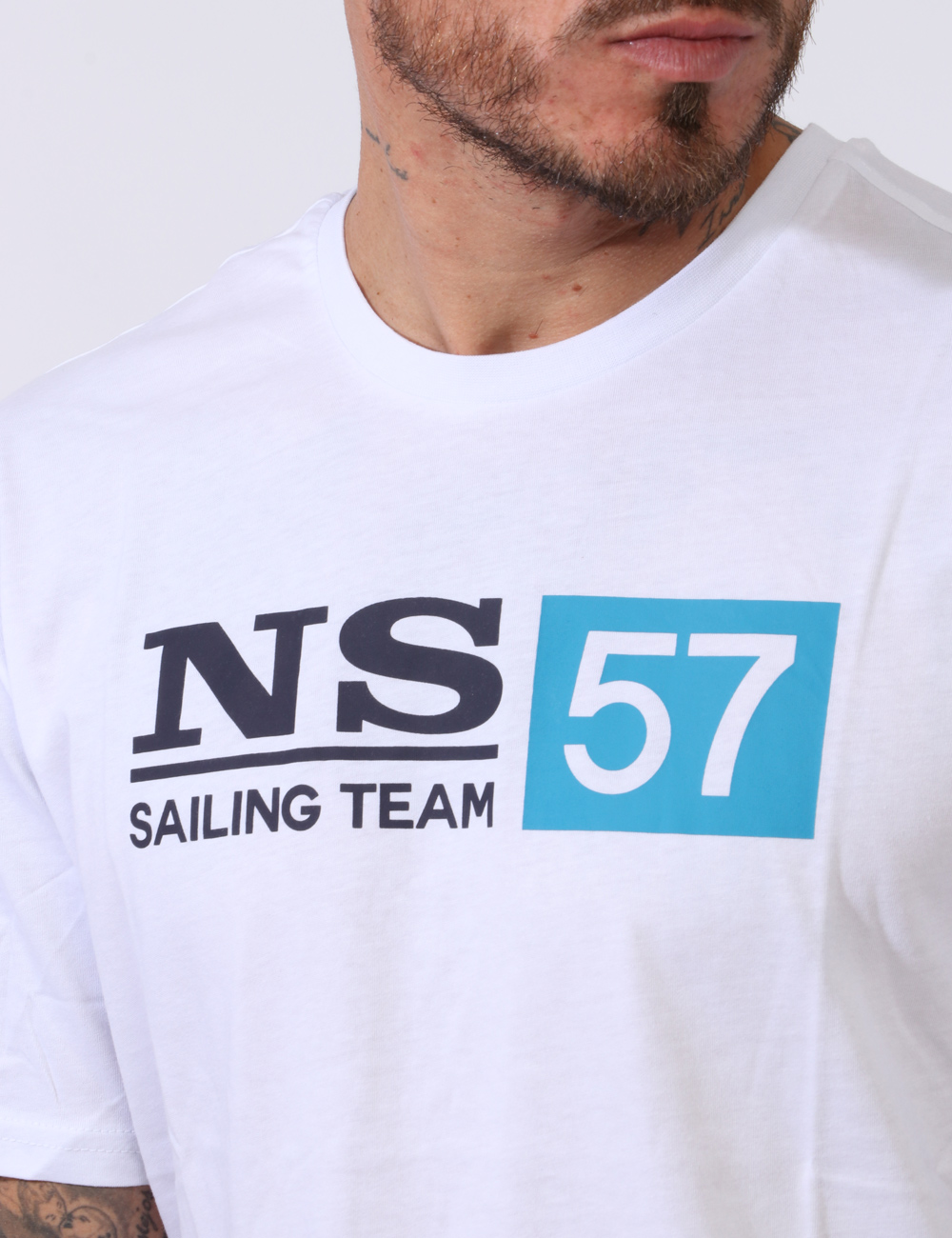 T-shirt su sfondo bianco con stampa centrale logo brand in nero e azzurro. La vestibilità è morbida e regolare. La t-shirt è adatta per occasioni casual/sportive facilmente combinabile per outfit diurni e serali. Un capo così non può mancare nel tuo guardaroba.