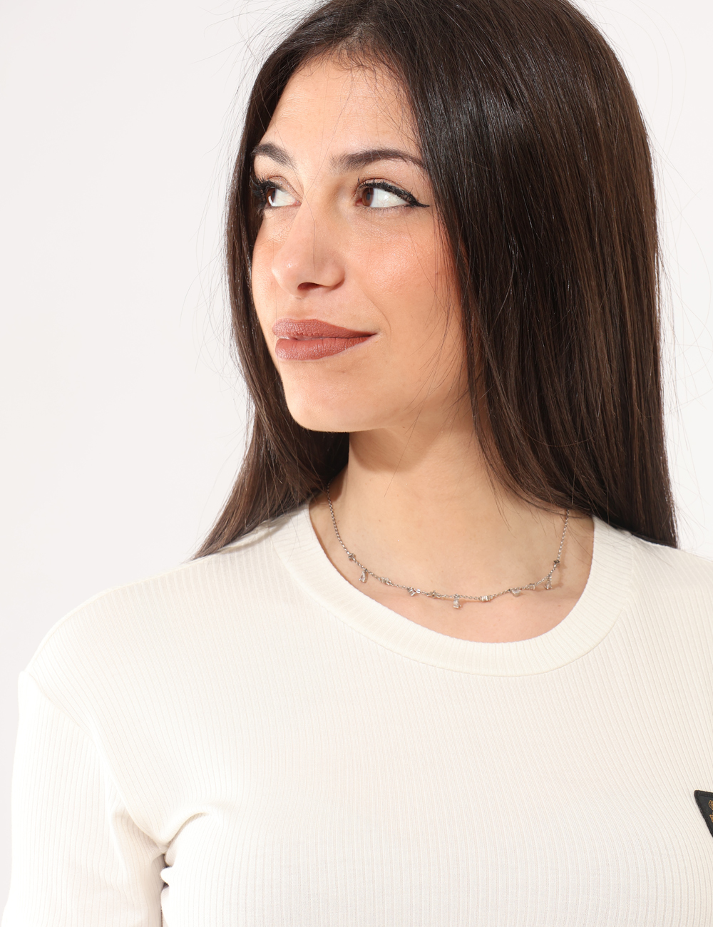 Realizzata in 95% viscosa e 5% elastane, offre una texture morbida, fluida e piacevolmente elastica che si adatta alle forme senza costringere. La T-shirt in tessuto viscosa, girocollo classico e patch logo brand si distingue per il design pulito e femminile: il girocollo valorizza la linea del collo, mentre il patch logo aggiunge un dettaglio distintivo e contemporaneo. La vestibilità è regolare, ideale per garantire libertà di movimento e comfort durante tutta la giornata. La modella è alta 165 cm e indossa la taglia S. Il capo è un pezzo unico di campionario, dettaglio che lo rende ancora più esclusivo.