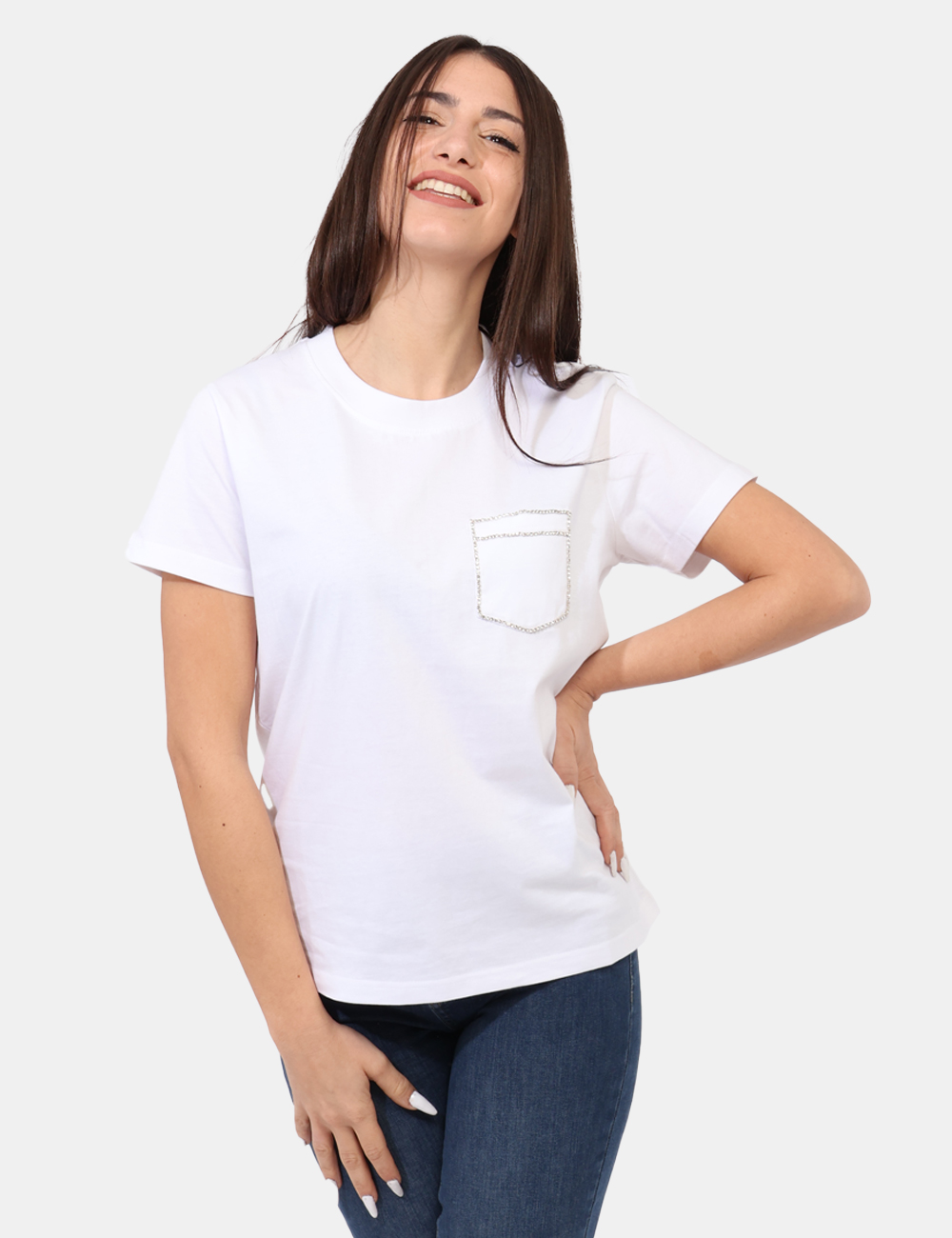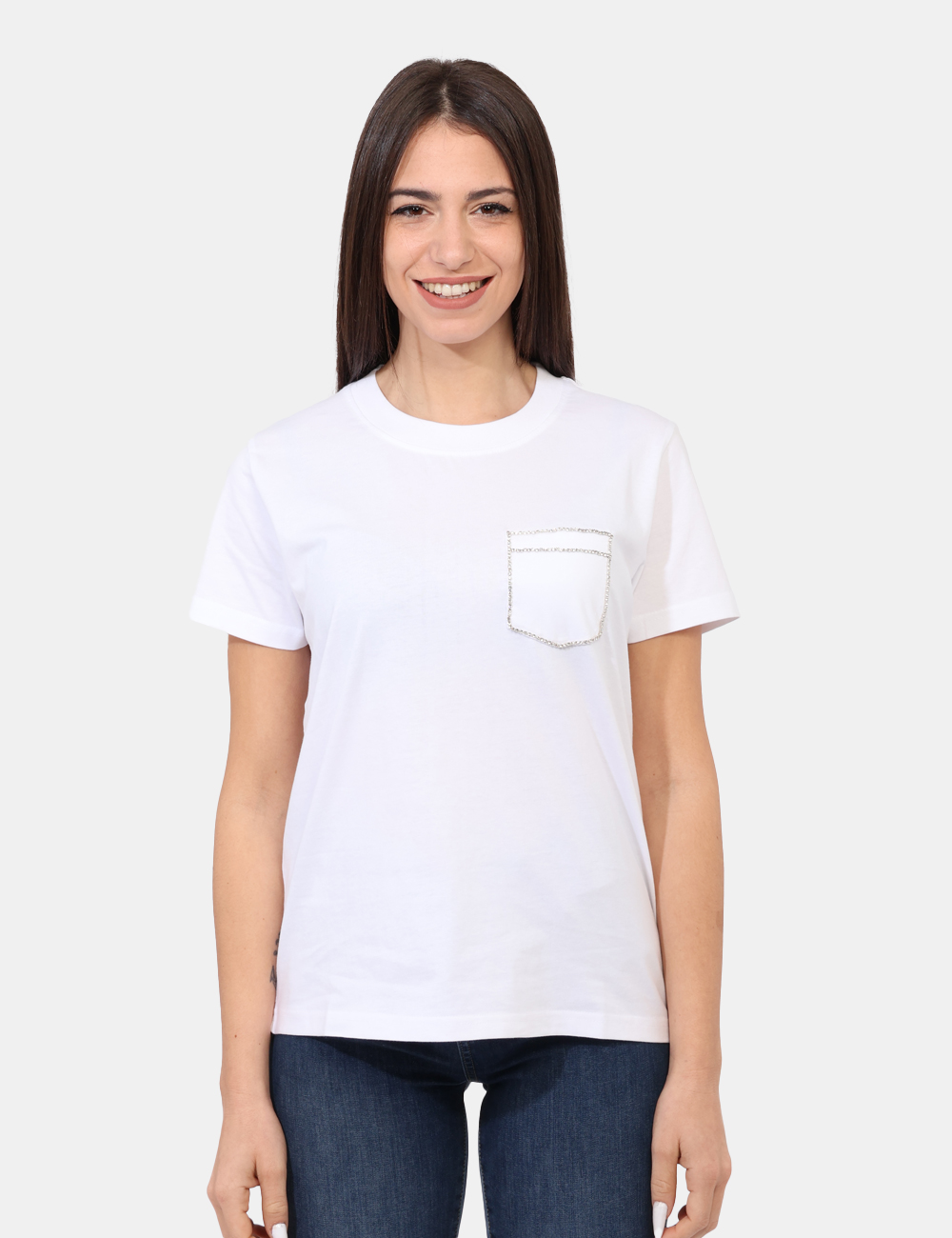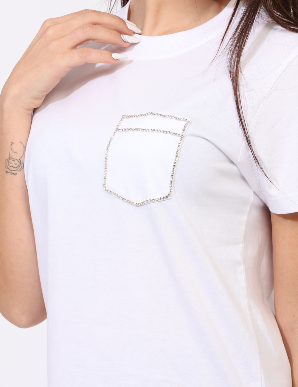 T-shirt in total bianco con taschino a toppa ad altezza cuore arricchito da glitter argentati. La vestibilità è morbida e regolare. La t-shirt è adatta per occasioni casual/raffinate. Se vuoi essere chic sai cosa indossare.