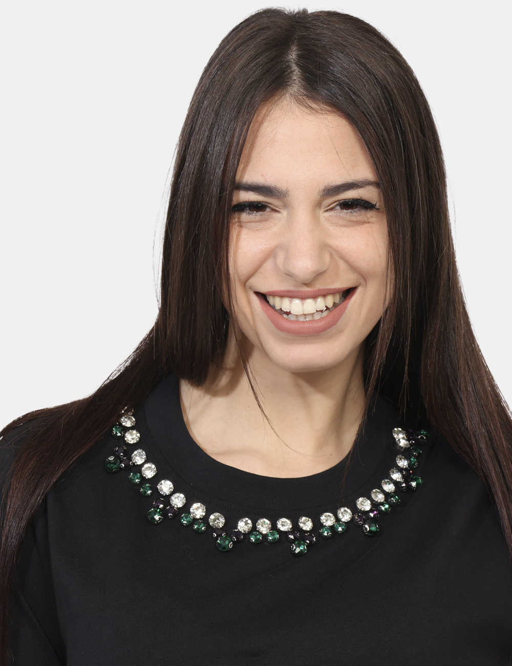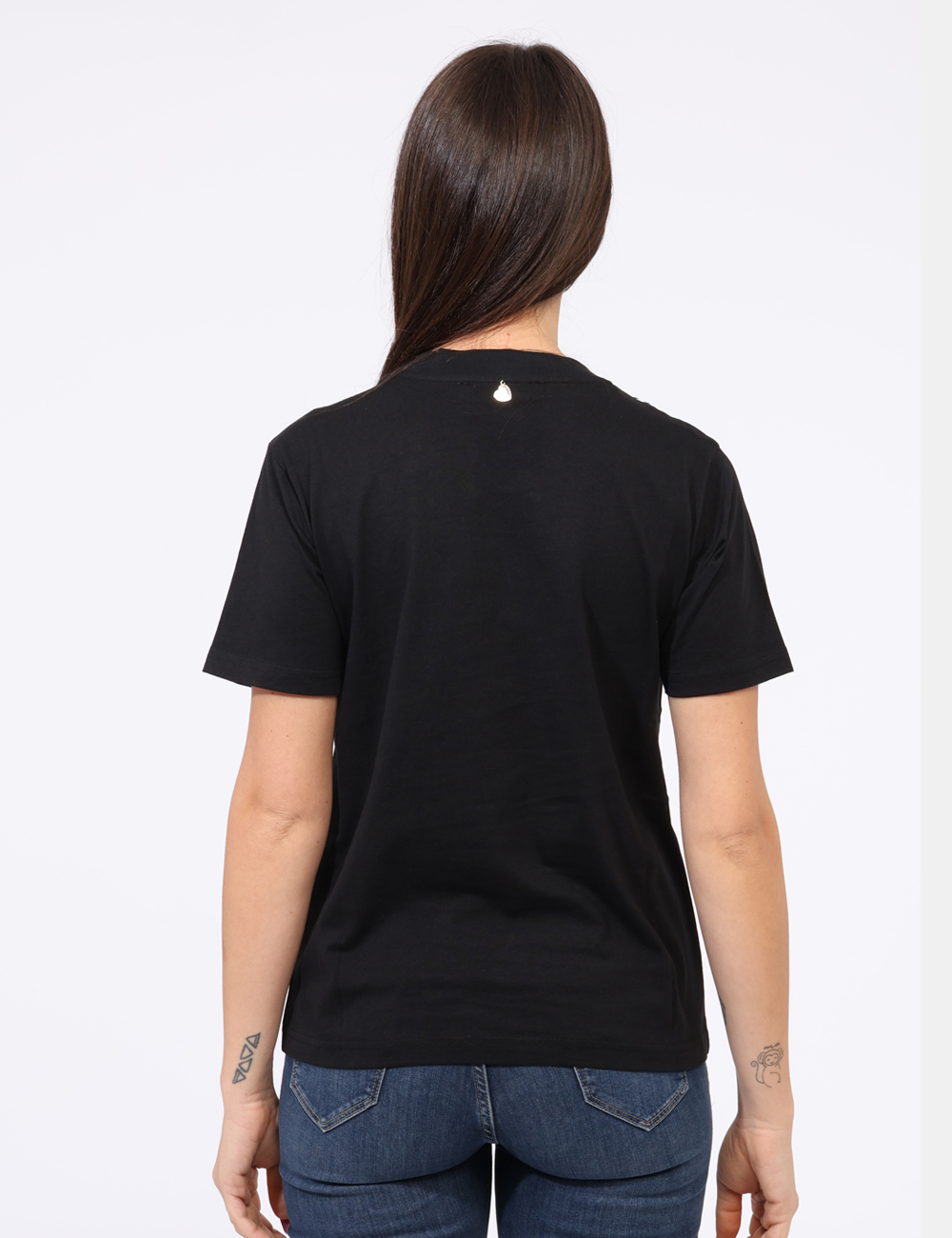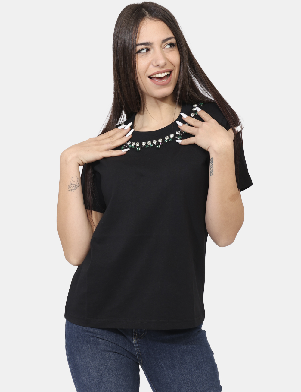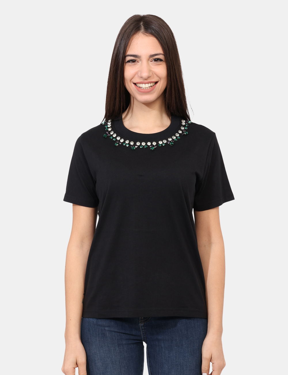 T-shirt in total nero con girocollo classico arricchito da glitter argentati e verdi. La vestibilità è morbida e regolare. La t-shirt è adatta per occasioni casual/raffinate. Se vuoi essere chic sai cosa indossare.