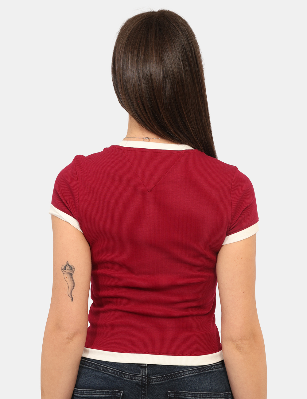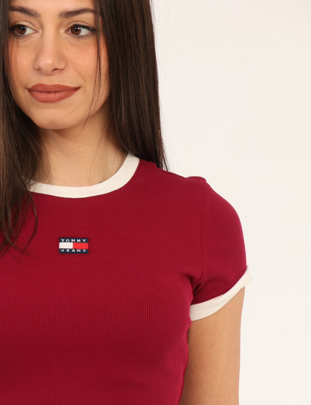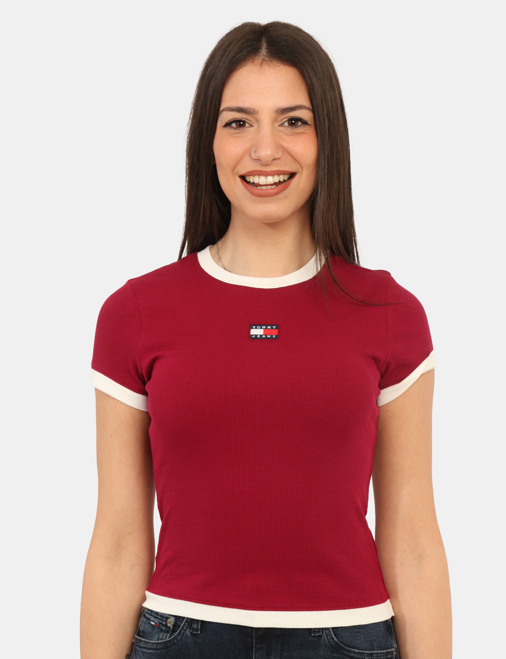 La T-shirt TOMMY HILFIGER Bordeaux da donna è un capo casual dal carattere moderno, perfetto per aggiungere un tocco di stile al tuo guardaroba quotidiano. Realizzata in 95% cotone e 5% elastane, questa T-shirt offre morbidezza, traspirabilità e una leggera elasticità che garantisce comfort durante tutta la giornata. Il design è valorizzato da una T-shirt con patch logo brand, bordini bianchi, dettagli che creano un piacevole contrasto cromatico e richiamano l’estetica iconica del marchio Tommy Hilfiger. Questa T-shirt da donna adatta alla stagione primavera estate è ideale per accompagnarti nelle giornate più dinamiche, quando desideri un capo pratico ma sempre curato. La vestibilità regolare valorizza la silhouette senza risultare troppo aderente, offrendo un equilibrio perfetto tra comfort e stile. La modella è alta 165 cm e indossa la taglia S, un riferimento utile per orientarti nella scelta della misura più adatta. Puoi indossarla nel tempo libero, durante una passeggiata in città o in occasioni casual, quando vuoi sentirti comoda ma sempre alla moda. Per un outfit semplice e di tendenza puoi abbinarla a jeans e sneakers per uno stile urbano e dinamico, oppure scegliere shorts o pantaloni casual e sandali per un look fresco e primaverile. Grazie al suo colore bordeaux elegante e ai dettagli distintivi, questa T-shirt è un capo versatile e facile da abbinare ai tuoi outfit di stagione. Su SecondaStrada.com trovi solo prodotti originali selezionati con attenzione. Questo modello Tommy Hilfiger è autentico ed è identificato dal codice articolo DW0DW22575 OB.