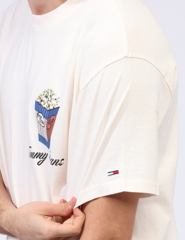 T-shirt originale su base bianco panna con doppia stampa (frontale e retro) di un pop corn box in tinta coordinata. La vestibilità è morbida e regolare. La t-shirt è adatta per occasioni casual e facilmente combinabile. Dona un tocco originale e divertente ai tuoi outfit.