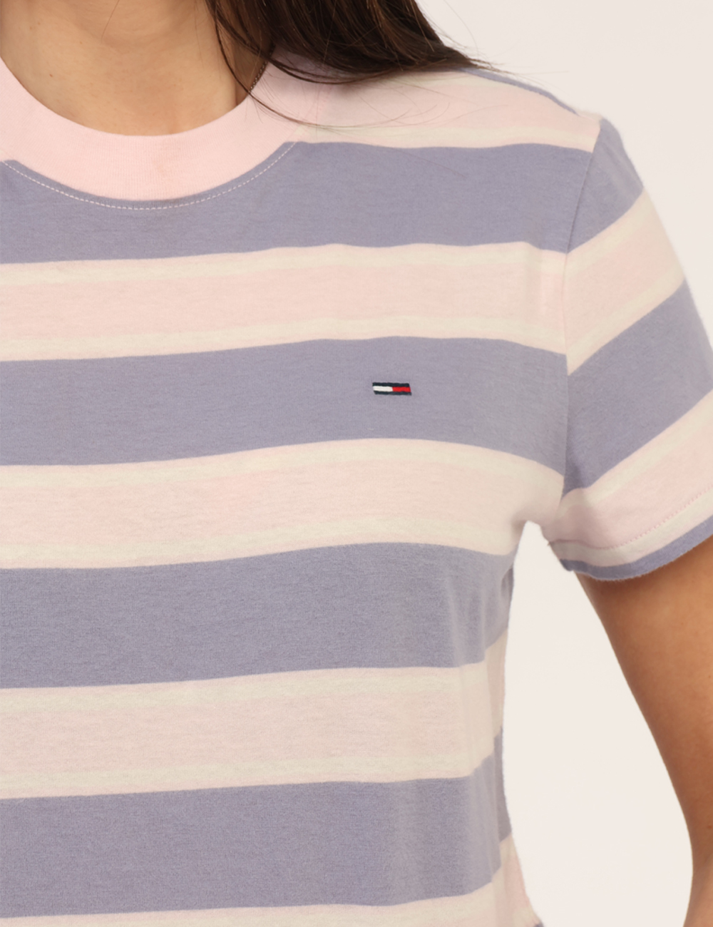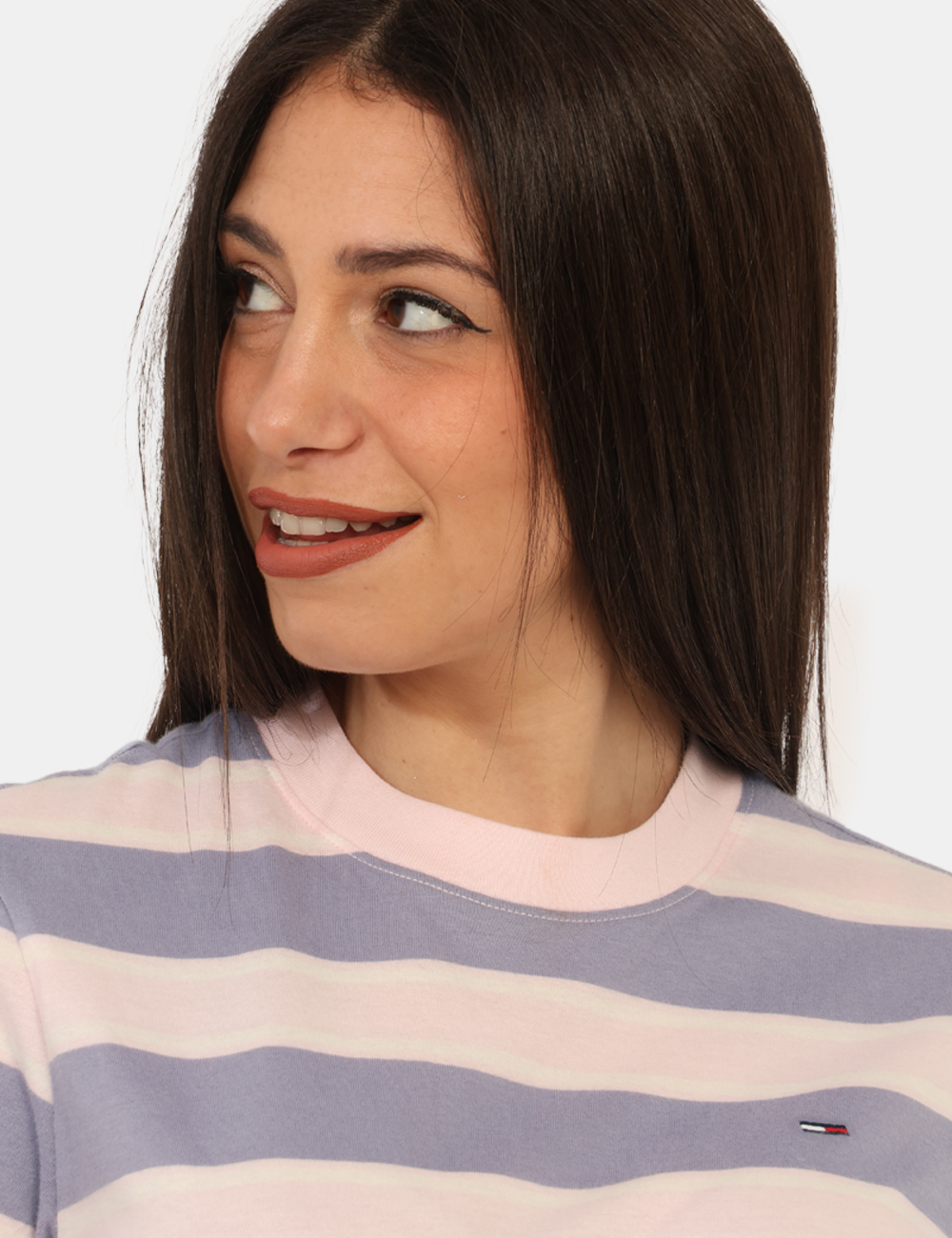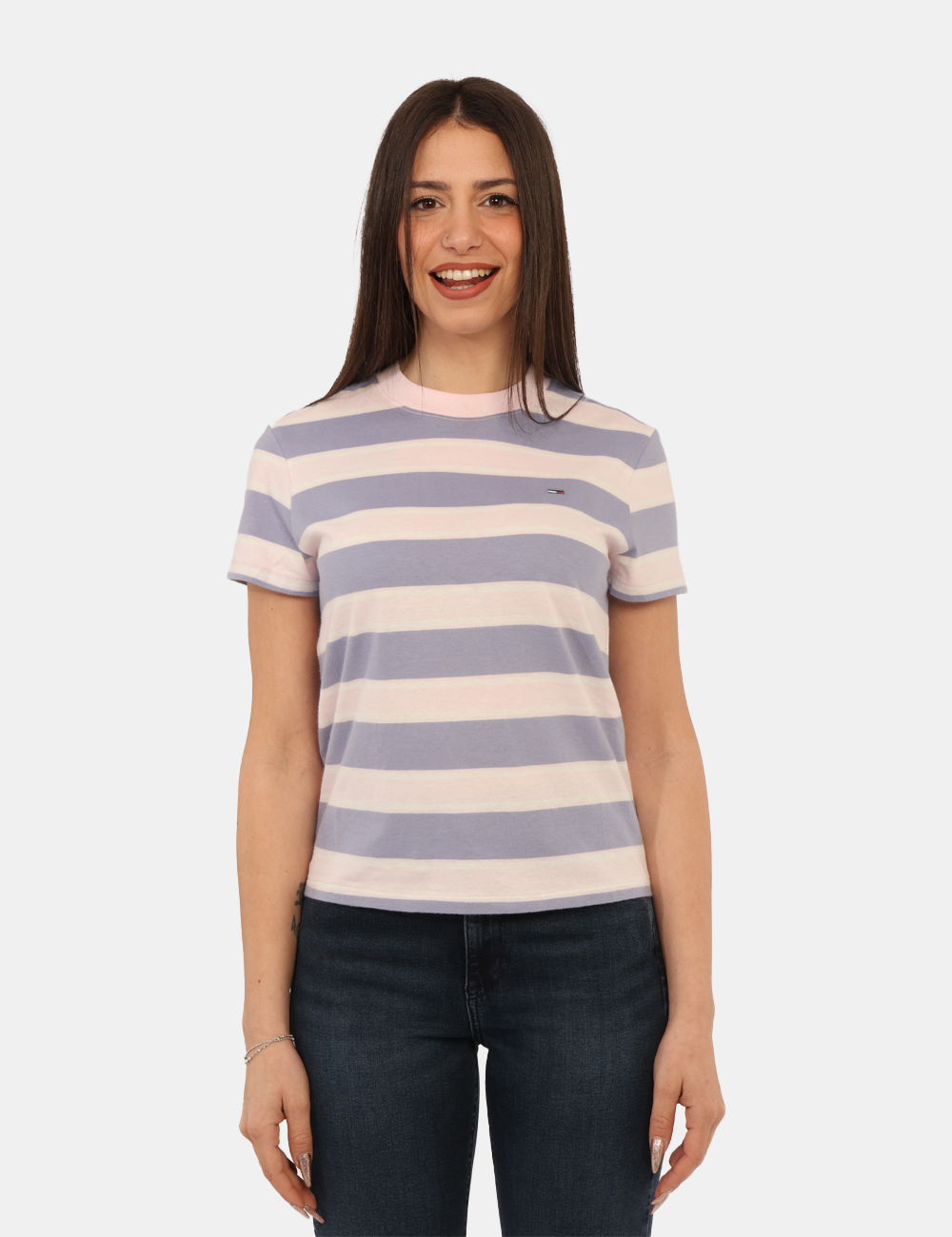 La T-shirt TOMMY HILFIGER Rosa da donna è un capo fresco e versatile, perfetto per aggiungere un tocco di colore e stile ai tuoi look quotidiani. Realizzata in 100% cotone, offre una sensazione di morbidezza e leggerezza sulla pelle, ideale per affrontare con comfort le giornate più miti. Il design è arricchito da un tessuto in fantasia rigata rosa e blu che dona dinamismo al capo, mentre il piccolo ricamo logo brand aggiunge un dettaglio raffinato e discreto, simbolo dell’inconfondibile stile Tommy Hilfiger. Questa T-shirt da donna adatta alla stagione primavera estate è pensata per accompagnarti nei momenti più informali della giornata, quando desideri sentirti comoda ma allo stesso tempo curata. La vestibilità regolare valorizza la silhouette senza risultare troppo aderente, rendendo il capo facile da indossare e da abbinare a diversi outfit. La modella è alta 165 cm e indossa la taglia S, offrendo un riferimento utile per la scelta della misura. Puoi indossarla nel tempo libero, durante una passeggiata in città o per occasioni casual in cui vuoi un look semplice ma femminile. Per un outfit pratico e di tendenza puoi abbinarla a jeans e sneakers, oppure scegliere shorts in denim e sandali per un look estivo fresco e dinamico. Grazie al suo design colorato ma elegante, questa T-shirt si inserisce facilmente nel guardaroba di stagione diventando un capo versatile e facile da indossare. Su SecondaStrada.com trovi solo prodotti originali selezionati con attenzione. Questo modello Tommy Hilfiger è autentico ed è identificato dal codice articolo DW0DW21834 OB.