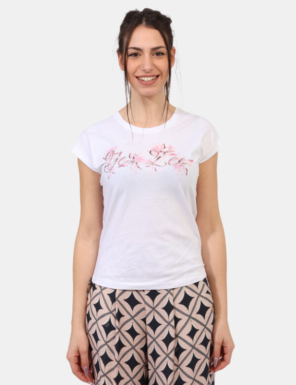 T-shirt classica su base bianca con stampa tendente al rosa arricchita da glitter argentati. La vestibilità è morbida e regolare. La t-shirt è adatta per occasioni casual e facilmente combinabile. Dona un tocco di luce ai tuoi outfit.