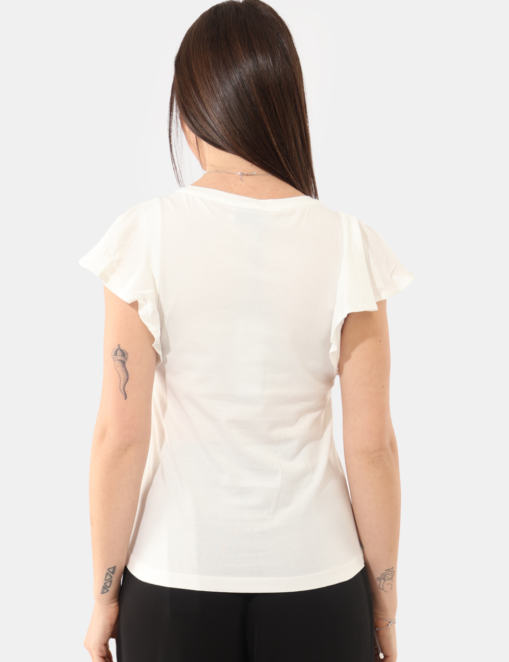 Realizzata in 95% cotone e 5% elastane, assicura morbidezza sulla pelle e una vestibilità confortevole che segue le linee del corpo senza risultare aderente. La vestibilità è regolare: la modella è alta 165 cm e indossa la taglia S, offrendo un riferimento utile per la scelta della misura. Questa T-shirt in Total bianco con stampa logo brand dorata, maniche con frill è pensata per accompagnarti con stile nelle giornate più luminose.