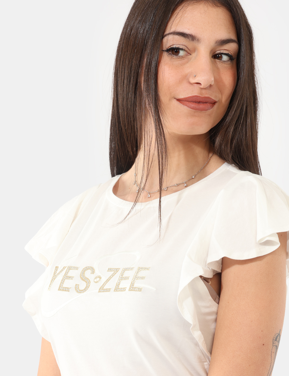 La T-shirt YES ZEE Bianca è il capo essenziale che illumina il guardaroba primaverile con un tocco raffinato. Questa T-shirt da donna adatta alla stagione primavera estate unisce la semplicità del total bianco alla luminosità della stampa logo brand dorata, impreziosita da eleganti maniche con frill che donano movimento e femminilità al look.