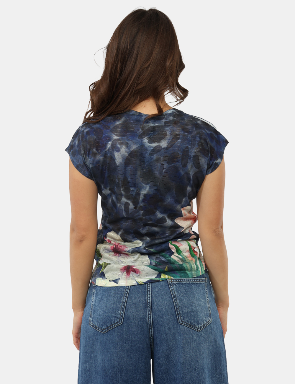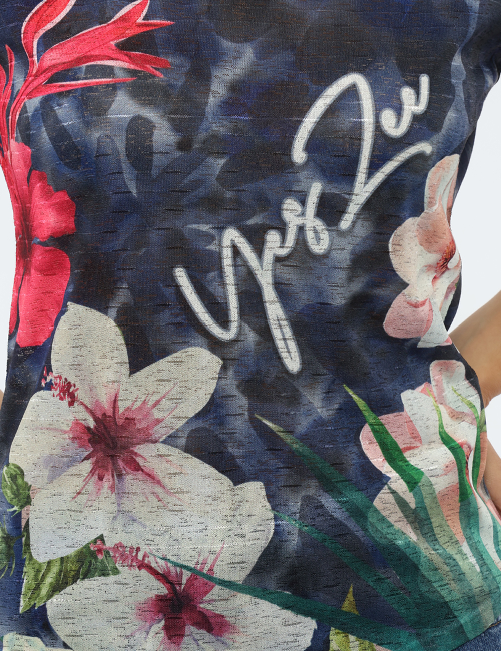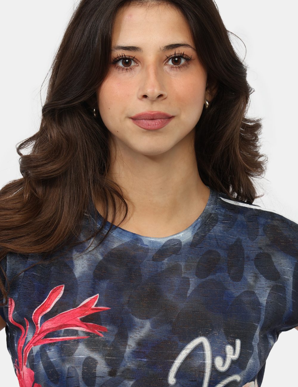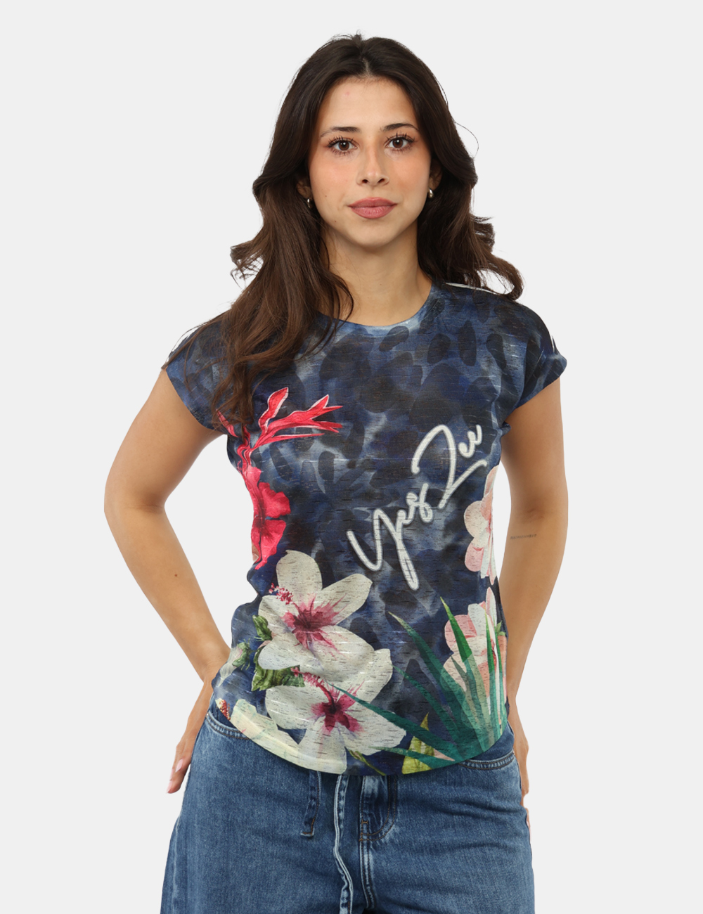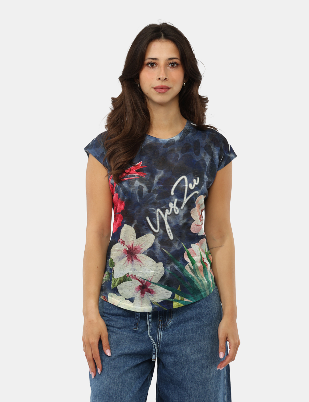 Puoi indossarla sia di giorno che di sera, creando outfit sempre attuali e facili da personalizzare. Abbinala a un jeans per un look casual e dinamico, oppure scegli un pantalone e aggiungi un blazer per un risultato più elegante e contemporaneo. La T-shirt con fantasia con fiore, logo Yes Zee al centro è perfetta per chi desidera un capo semplice ma con carattere.