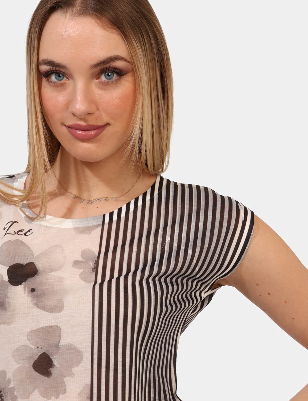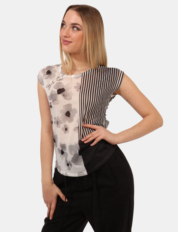 T-shirt velata a giromanica su base bianca con fantasia rigata e floreale nera. La vestibilità è morbida e regolare. La t-shirt è adatta per occasioni casual e facilmente combinabile. Praticità e stile in un solo capo.