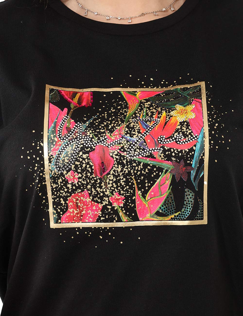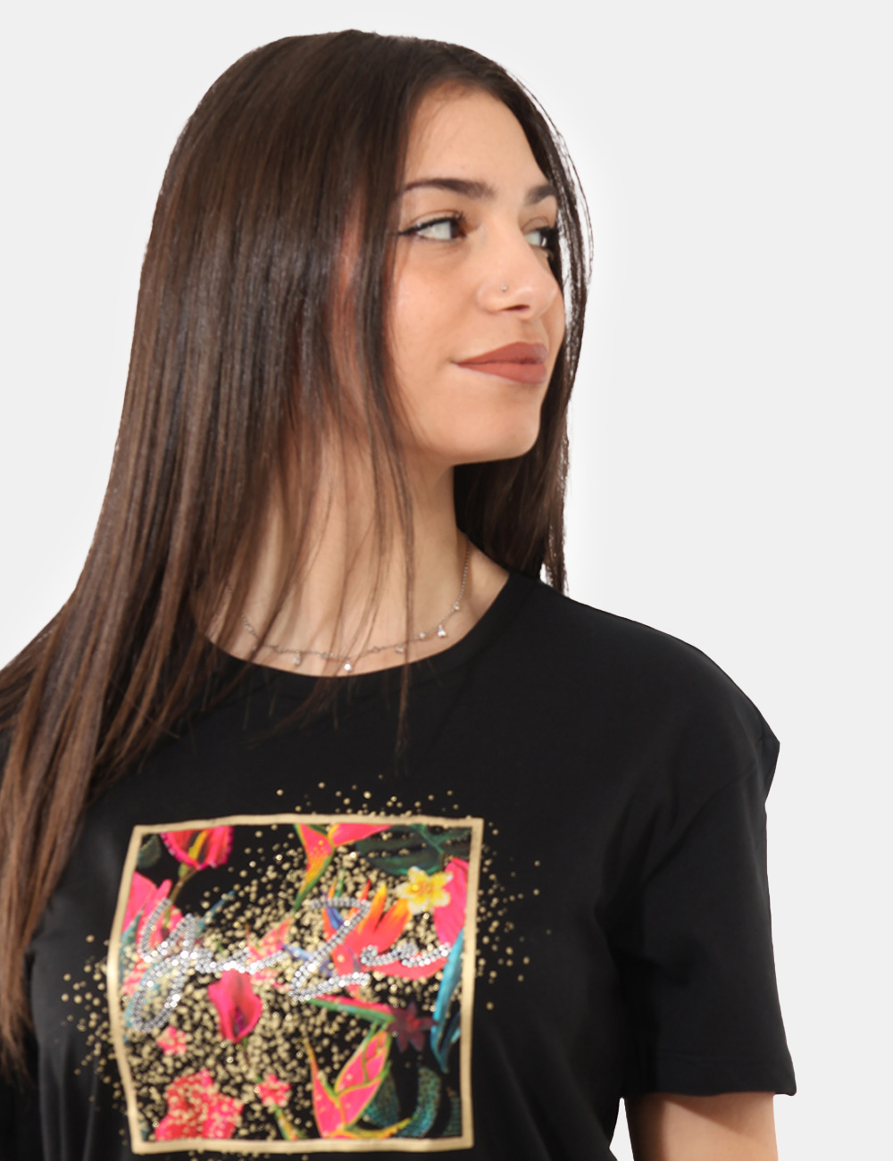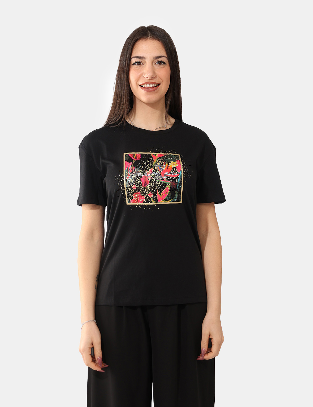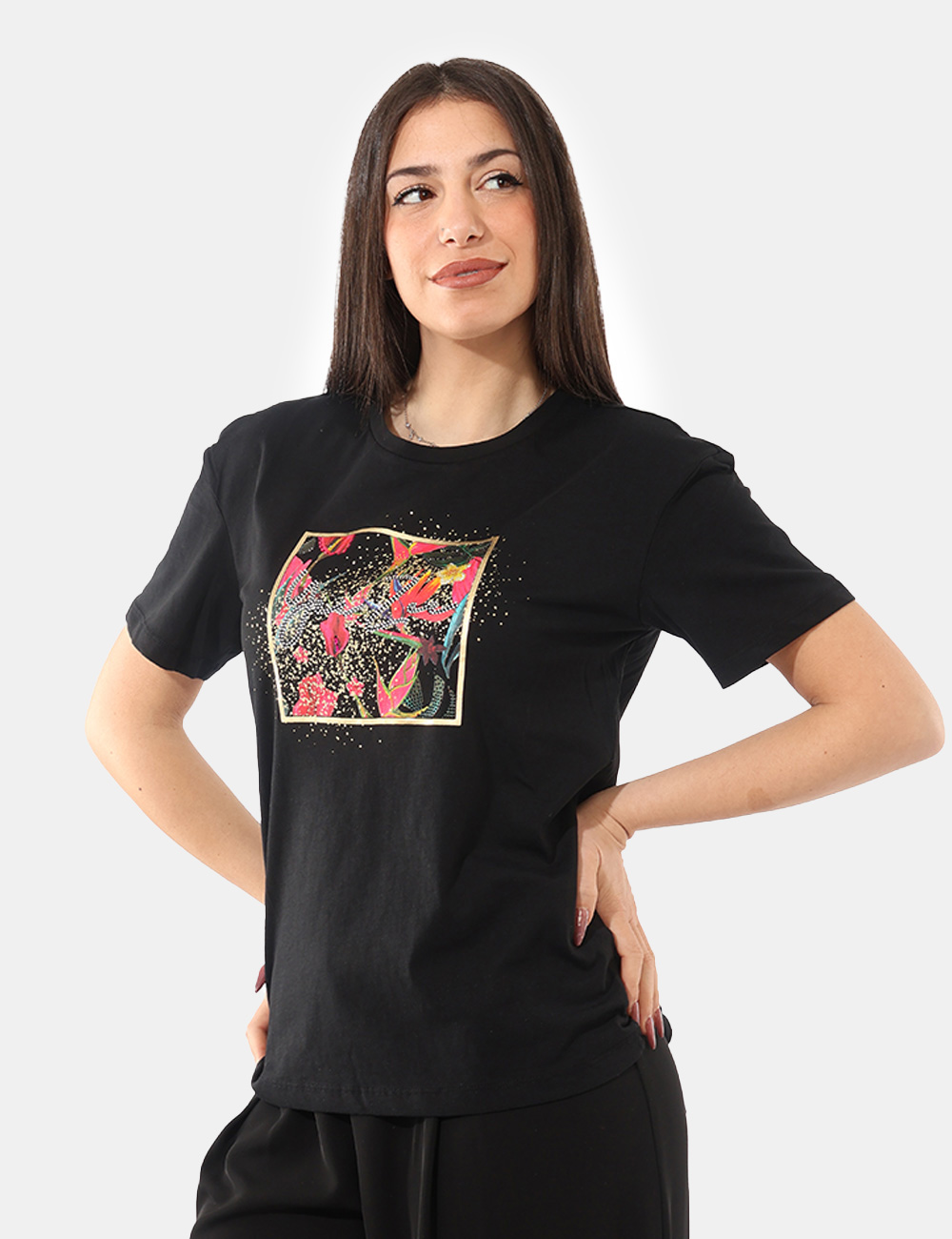 Questa è una T-shirt con stampa colorata arricchita da glitter argentati e dorati, pensata per chi ama uno stile casual ma curato nei particolari. La vestibilità regolare valorizza la silhouette in modo naturale e garantisce comfort durante tutta la giornata. La modella è alta 165 cm e indossa la taglia S, un riferimento utile per orientarti nella scelta della misura più adatta.
