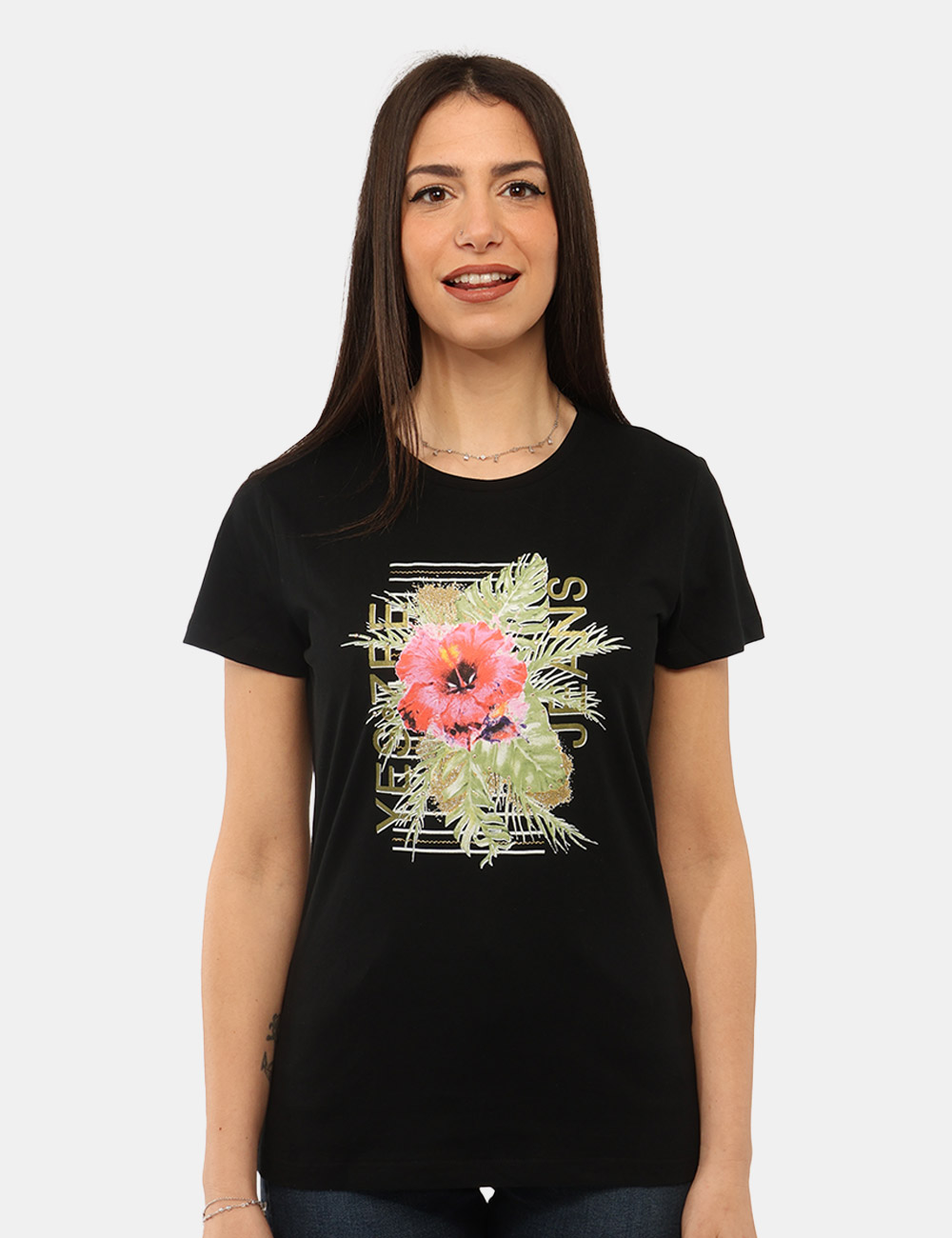 La T-shirt YES ZEE Nera è il capo perfetto per chi ama uno stile semplice ma con dettagli capaci di fare la differenza. Realizzata in 100% cotone, è morbida, traspirante e ideale per accompagnarti con comfort durante tutta la giornata. Il design è valorizzato da una stampa coordinata con glitter, che illumina il look con discrezione e aggiunge un accento femminile e contemporaneo.