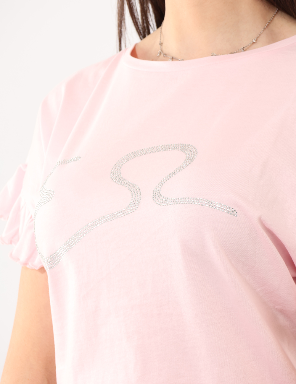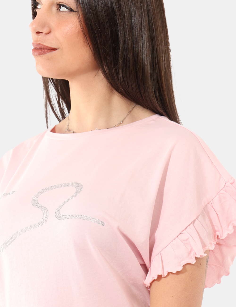 Realizzata in 100% cotone, garantisce comfort e traspirabilità, ideale quando le temperature si alzano. La vestibilità è regolare e valorizza la silhouette senza risultare aderente: la modella è alta 165 cm e indossa la taglia S, un riferimento utile per orientarti nella scelta della misura. La T-shirt in total rosa con logo brand glitterato argento, frill sulle maniche unisce semplicità e dettagli ricercati. Il rosa dona un’allure delicata e contemporanea, mentre il logo glitterato argento illumina il capo con un tocco brillante. I frill sulle maniche aggiungono movimento e una nota romantica che rende il look più originale.