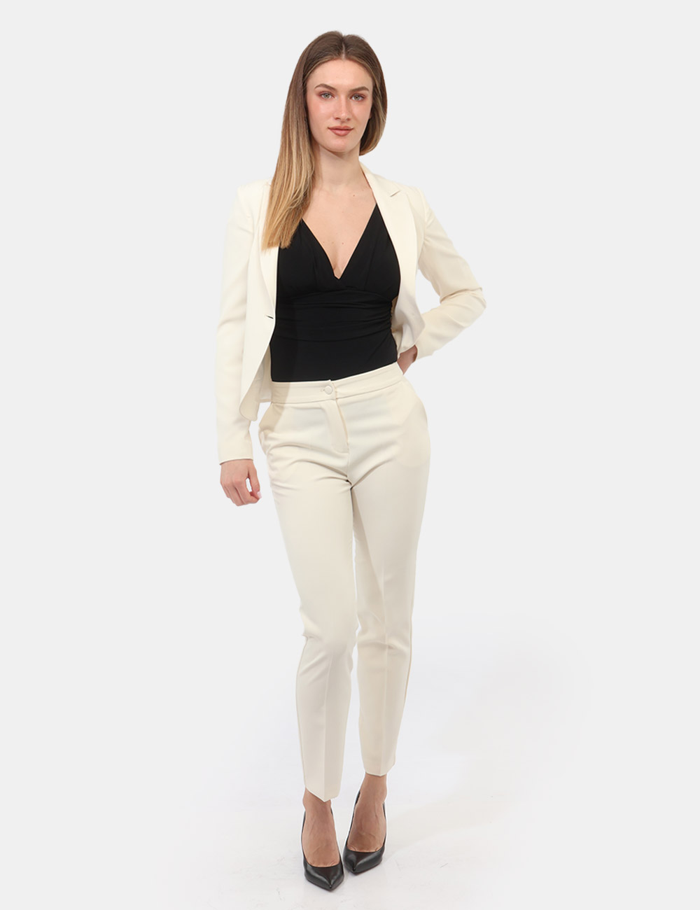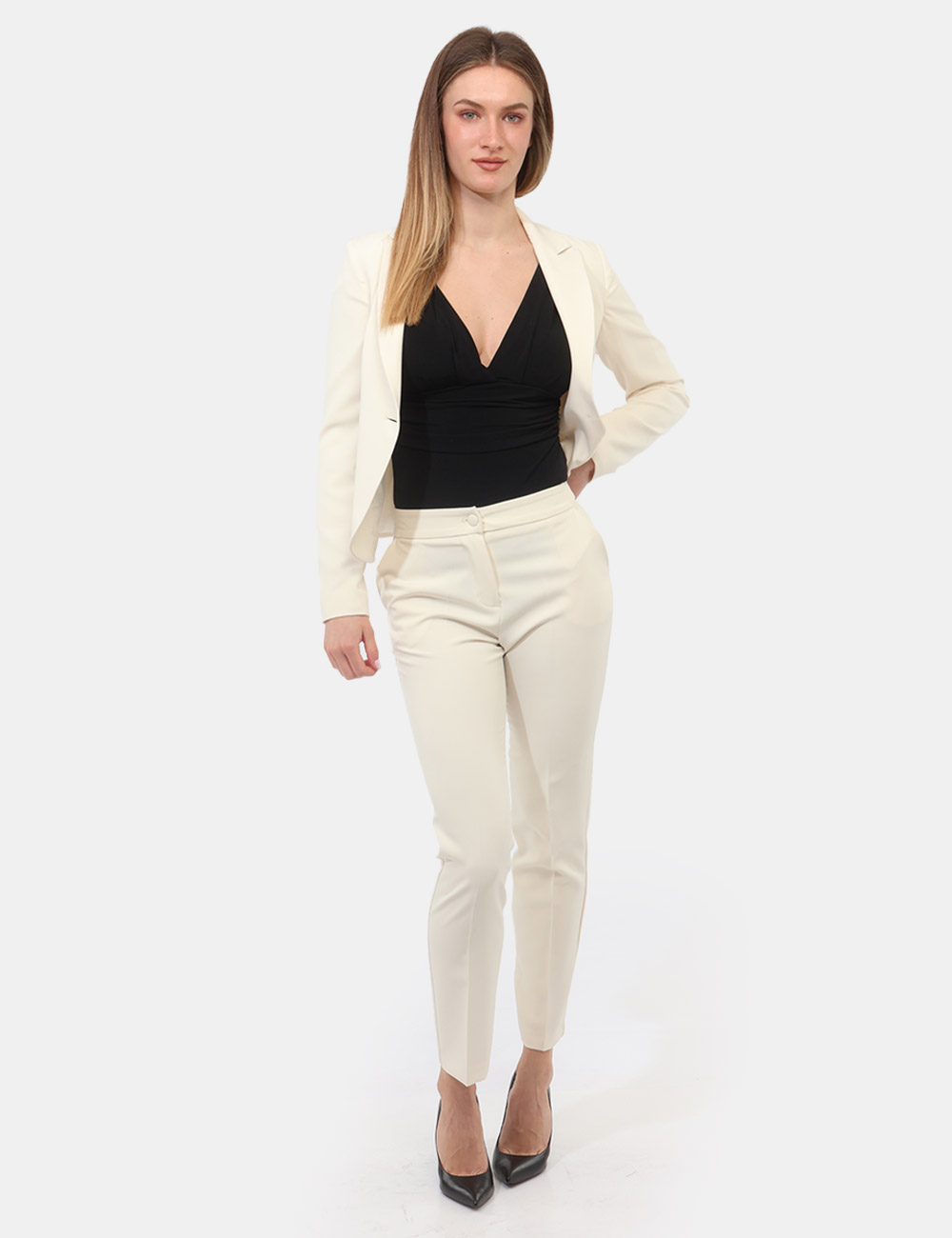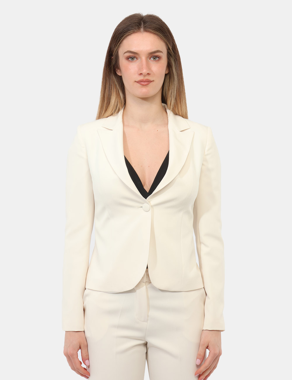 Il Tailleur Giacca Pantalone con giacca sciancrata corta con un bottone e pantalone dritto è un capo essenziale che interpreta con naturalezza eleganza e contemporaneità.