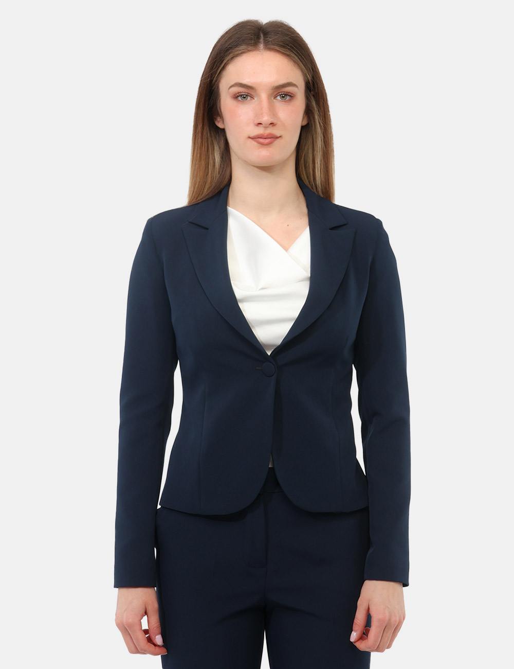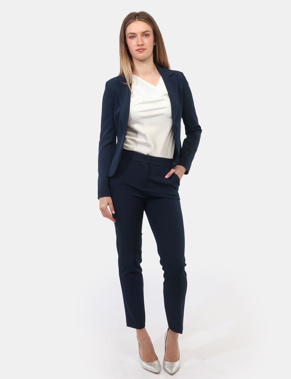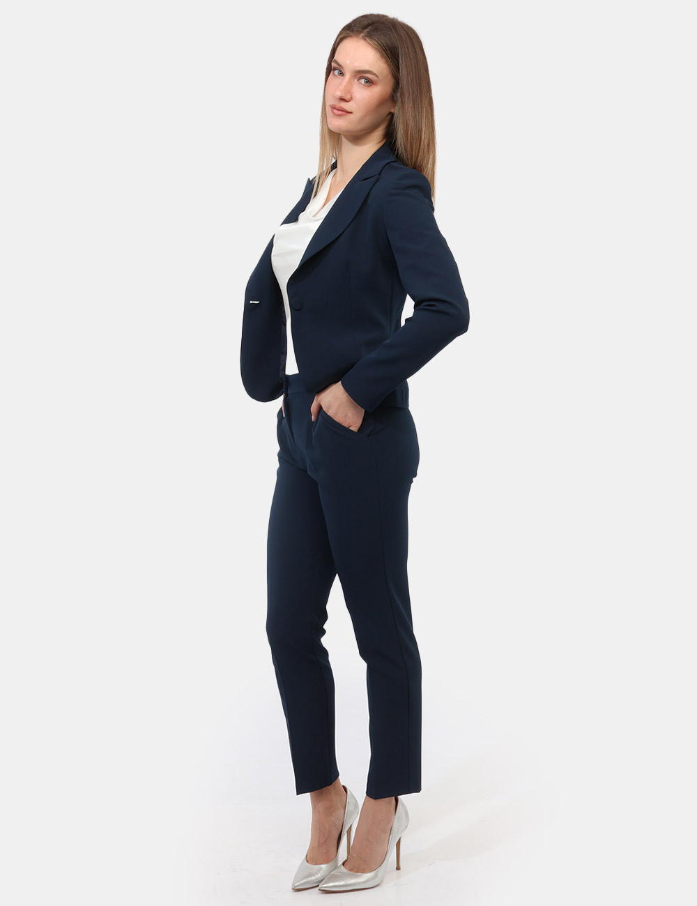 Il Tailleur Giacca Pantalone con giacca sciancrata corta con un bottone e pantalone dritto è una scelta senza tempo, capace di adattarsi al tuo stile con naturalezza.