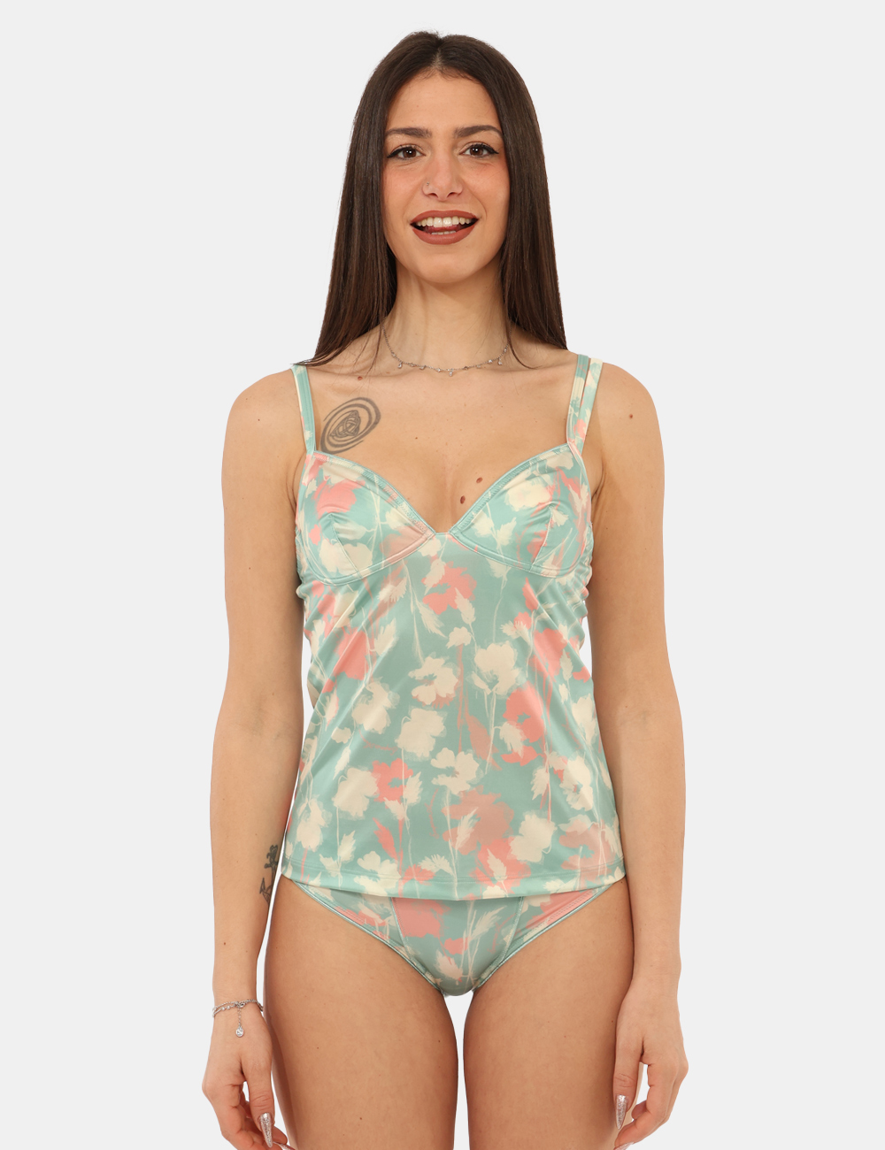 Il Top con tessuto lucido, fantasia rosa, spalline strette regolabili è ideale nel tempo libero d’estate, per una giornata al mare o un aperitivo vista tramonto. Puoi abbinarlo al costume coordinato e a un paio di infradito per un look beachwear ricercato, oppure indossarlo con shorts leggeri per uno stile casual e luminoso.