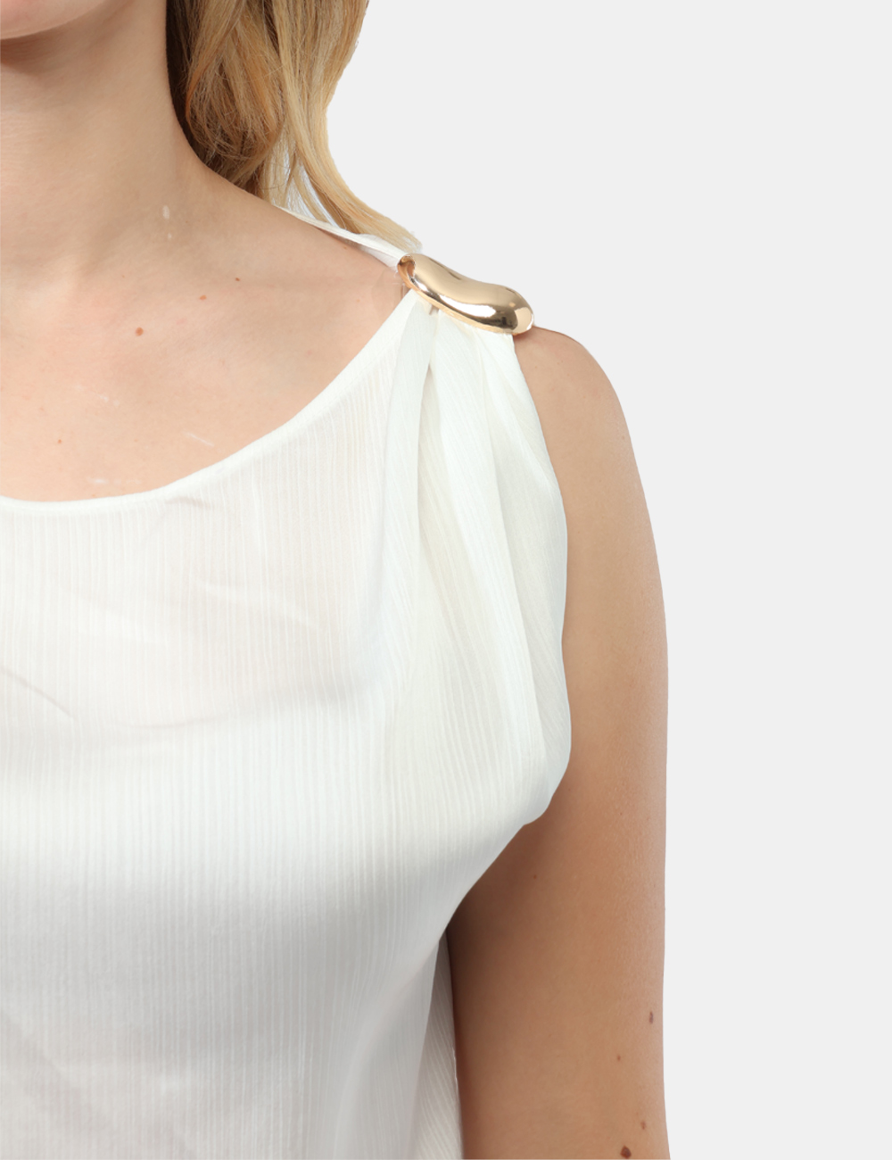 Realizzato in 100% poliestere, questo top da donna adatto alla primavera estate offre una vestibilità regolare, pensata per garantire comfort e libertà di movimento durante tutta la giornata. Il design monospalla con fermaglio dorato aggiunge carattere e femminilità, creando un equilibrio perfetto tra semplicità e dettaglio prezioso.