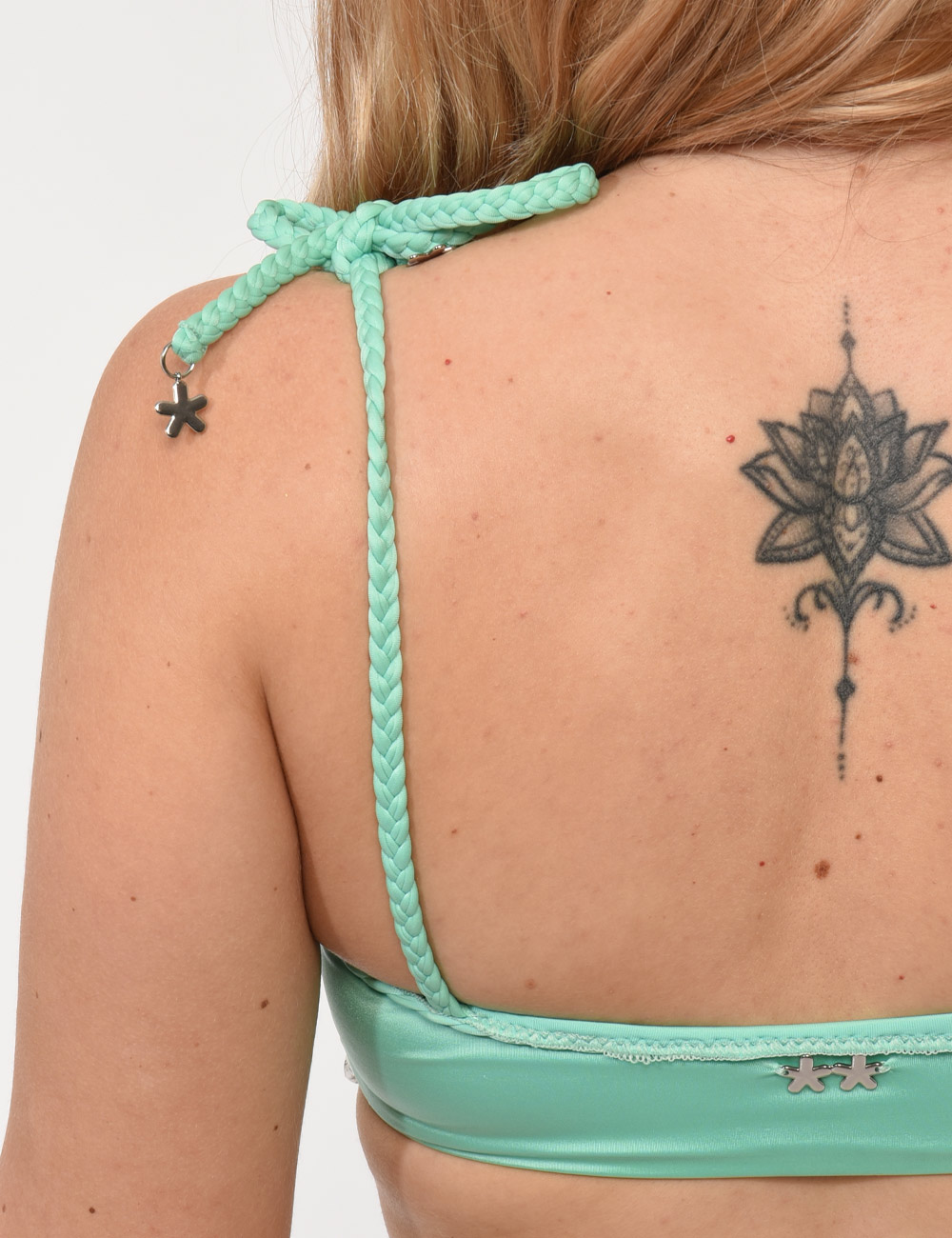 Costume modello bikini a fascia in total verde acquamarina con spalline strette intrecciate e regolabili. La vestibilità è morbida e pratica grazie a gancino sul retro. Il bikini è adatto per l’estate e per la spiaggia. Troppo fashion per non innamorartene a prima vista. L’articolo appartiene al campionario esclusivo di stagione: pezzo unico.