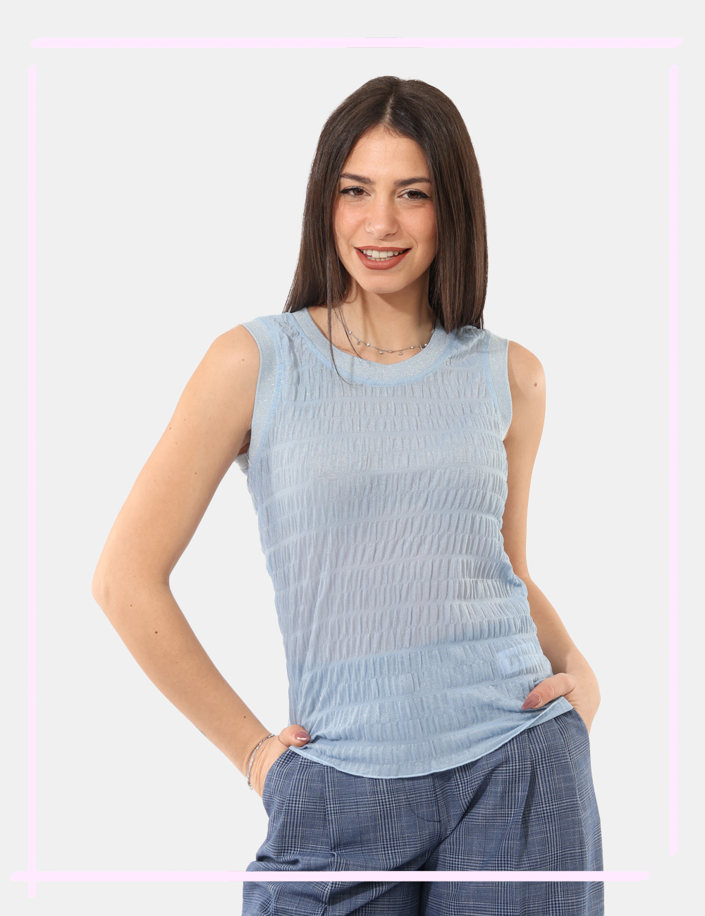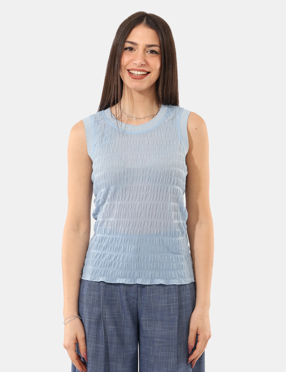 Il design si distingue per i dettagli ricercati: Top con tessuto semitrasparente, filo lurex, spalline larghe, elementi che donano un tocco glamour senza rinunciare al comfort. Il colore azzurro, fresco e delicato, illumina l’incarnato e si presta a molteplici interpretazioni di stile. Puoi indossarlo nel tempo libero, in occasioni casual o per un aperitivo serale, quando desideri un look semplice ma d’effetto.