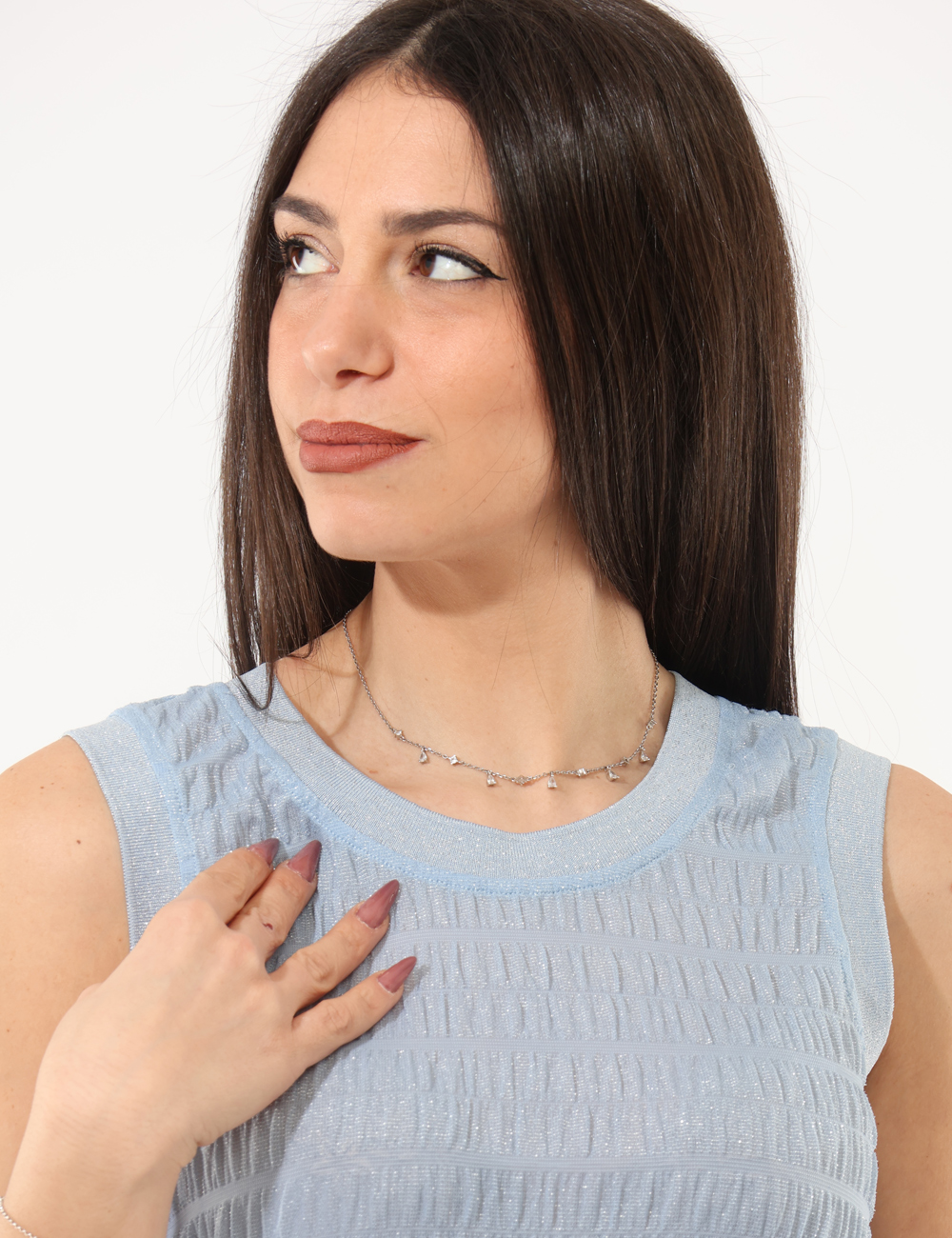 Top FRACOMINA Azzurro da donna, un capo luminoso e femminile pensato per dare carattere ai tuoi look della bella stagione. Realizzato in 90% nylon, 5% lurex e 5% elastane, unisce leggerezza, elasticità e un delicato effetto brillante che valorizza ogni outfit. Questo Top da donna adatto alla stagione primavera estate è perfetto per accompagnarti nelle giornate più calde grazie alla vestibilità regolare, che segue le linee del corpo con naturalezza. La modella è alta 165 cm e indossa la taglia S. Pezzo unico di campionario.