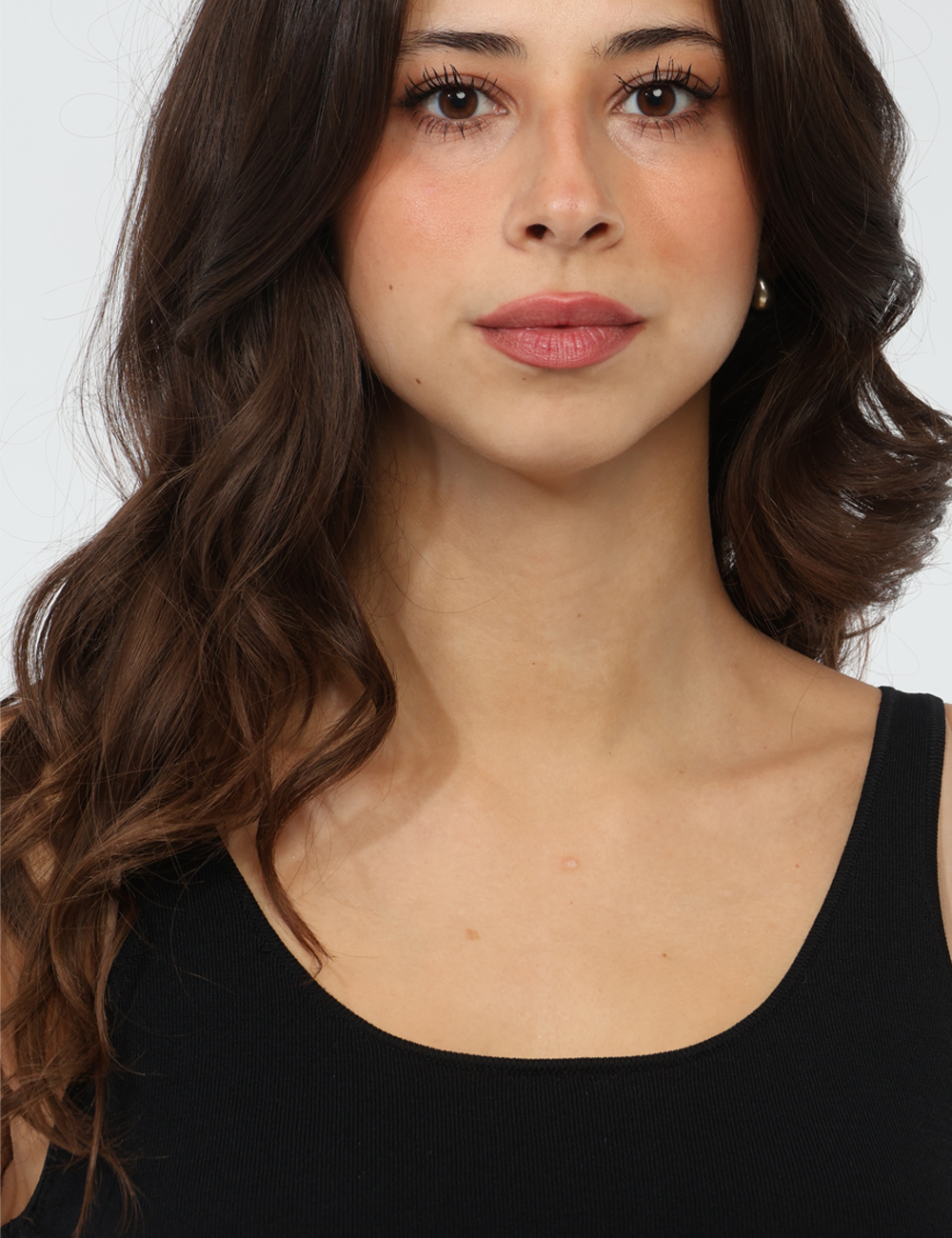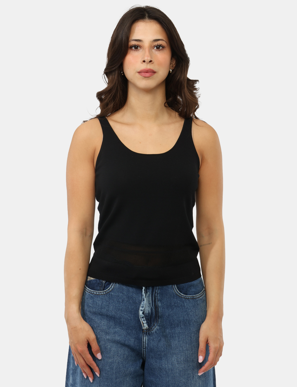 La modella è alta 172 cm e veste la taglia S, confermando una vestibilità regolare studiata per offrire libertà di movimento e comfort. Il Top MATERICA Nero è un capo versatile e femminile, perfetto per arricchire il tuo guardaroba con semplicità e carattere.