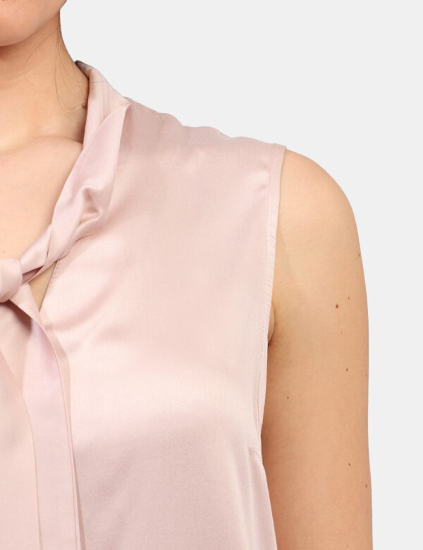 Top in simil raso color rosa cipria, a giromanica e con scollo morbido annodabile. La vestibilità è morbida e regolare. Il top è adatto per occasioni casual/raffinate e facilmente combinabile. Dona un tocco di stile ai tuoi outfit.
