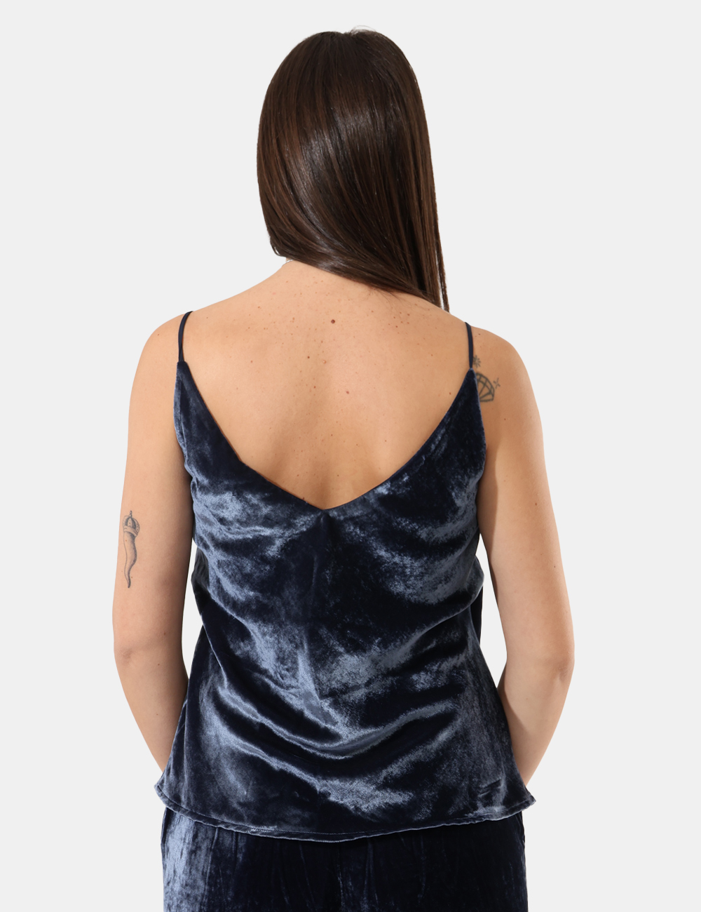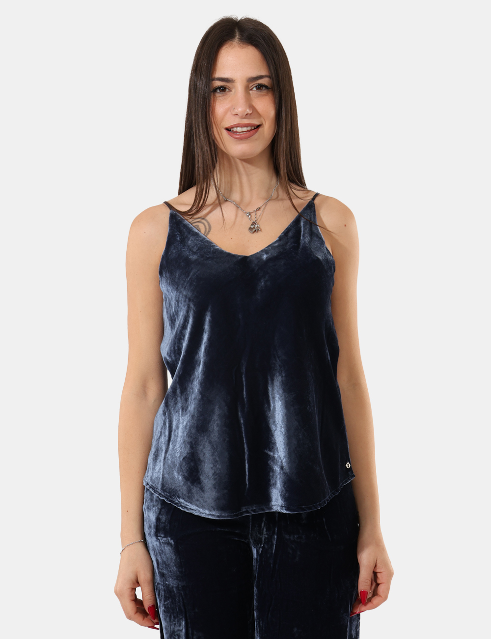 Top in ciniglia con spallina sottile, ideale abbinato al suo pantalone.