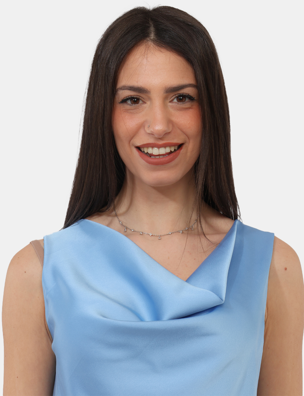 Il colore azzurro dona luminosità e leggerezza, rendendo questo top con scollo morbido, tessuto lucido un alleato versatile per creare outfit sempre nuovi e armoniosi.