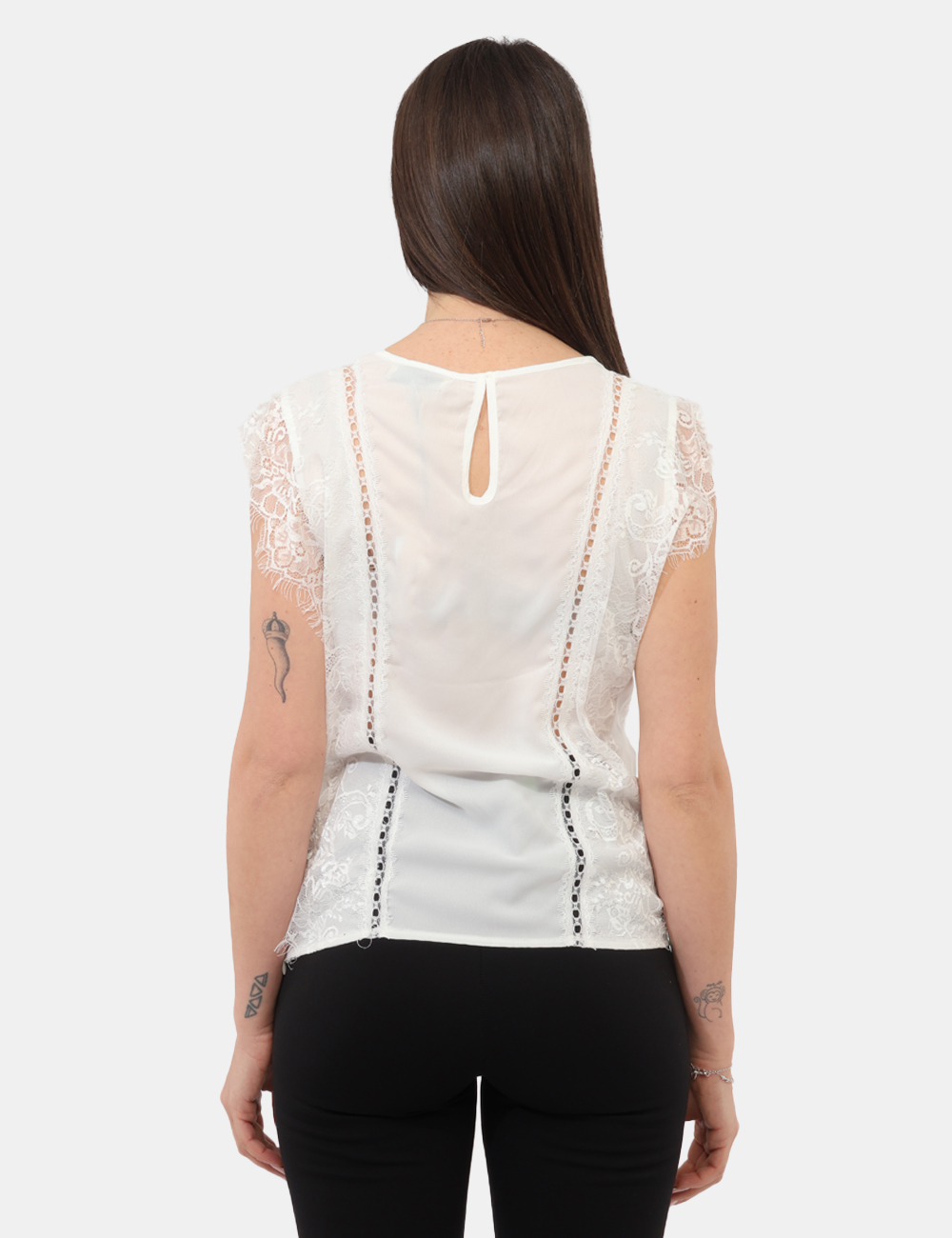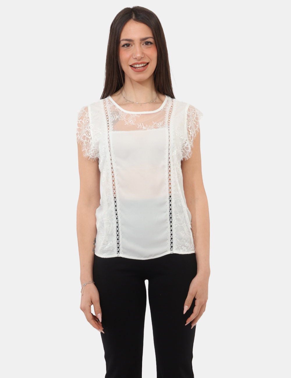 Realizzato in 100% poliestere, offre una vestibilità leggera e confortevole, ideale sia per essere indossato da solo nelle giornate più calde sia come base sotto altri capi nei mesi più freschi. Il design è impreziosito da inserti in pizzo, che donano un tocco femminile e sofisticato, rendendo questo top con inserti in pizzo un capo semplice ma ricercato. La vestibilità regolare segue naturalmente la silhouette: la modella è alta 165 cm e indossa una taglia S.