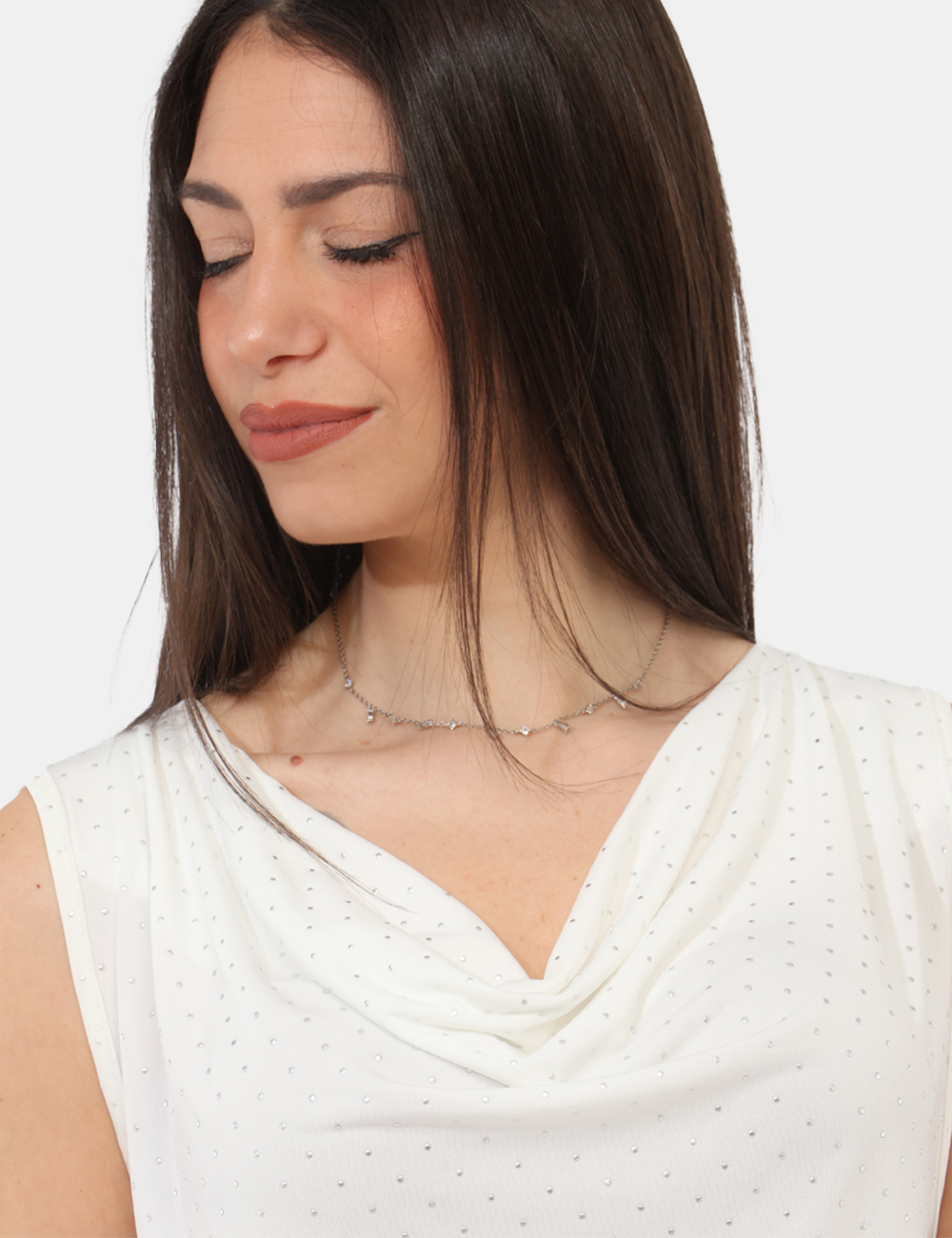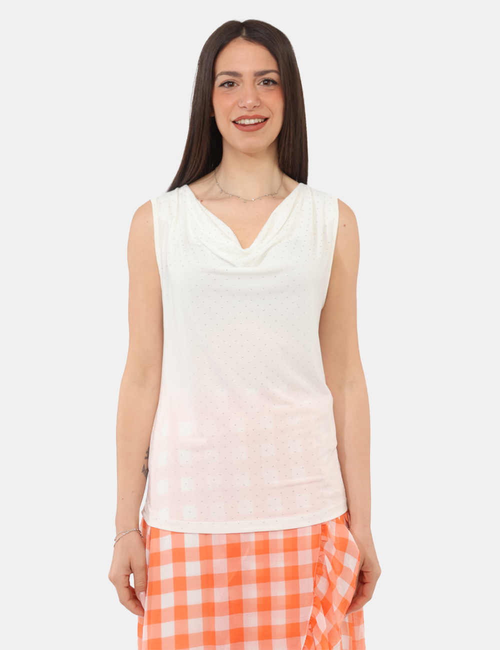 Il design è valorizzato dallo scollo morbido, che dona un tocco femminile e raffinato, mentre le borchiette aggiungono un dettaglio luminoso e contemporaneo. Questo top con scollo morbido e borchiette riesce così a bilanciare semplicità e personalità, rendendolo perfetto sia per look casual che più curati.