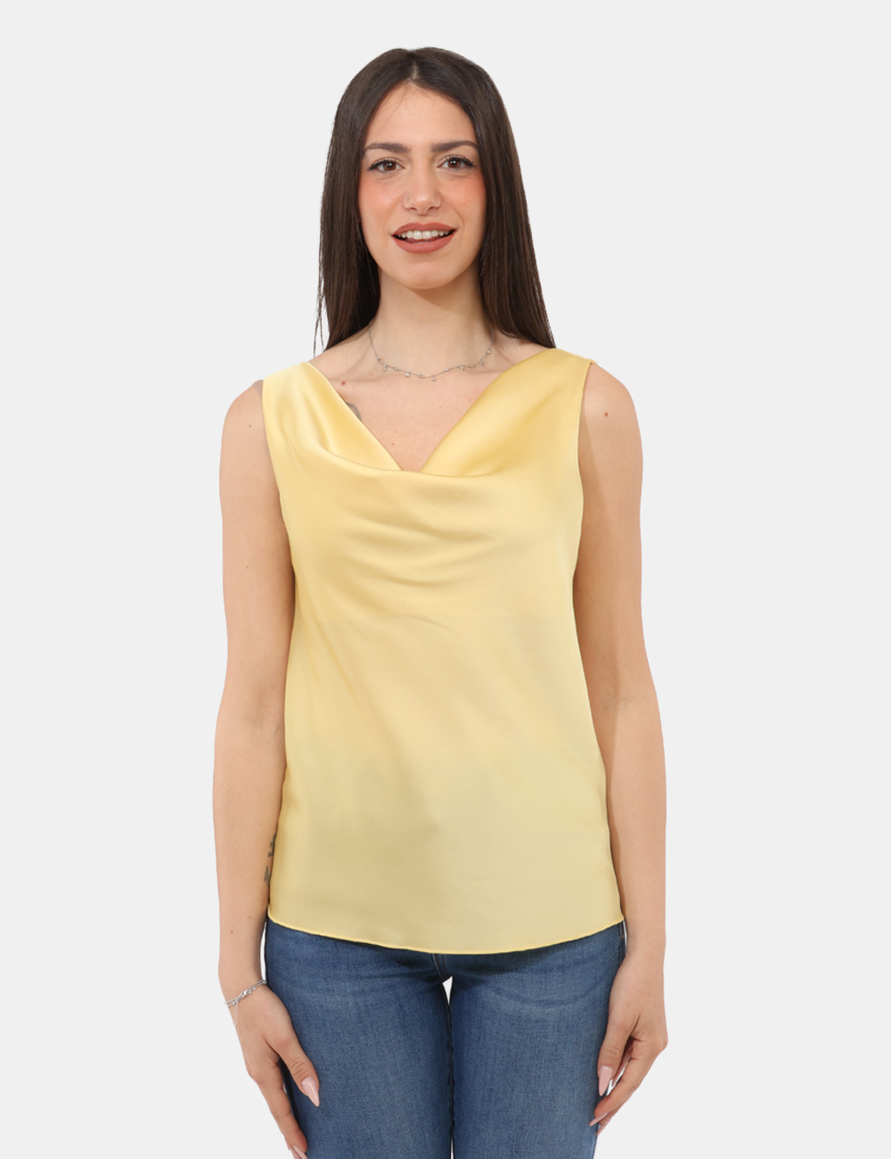 Il colore giallo illumina l’incarnato e aggiunge personalità, rendendo questo top con scollo morbido, tessuto lucido un alleato perfetto per ogni occasione.