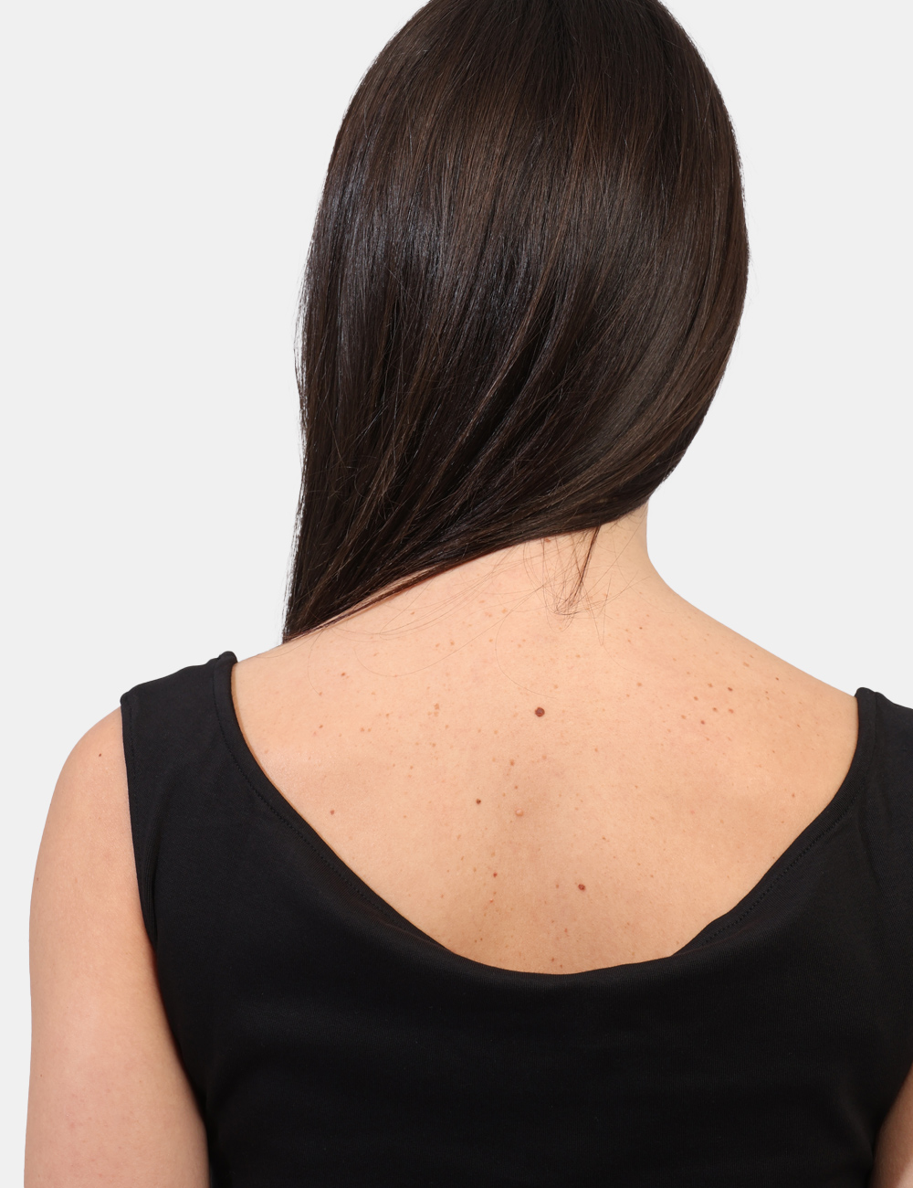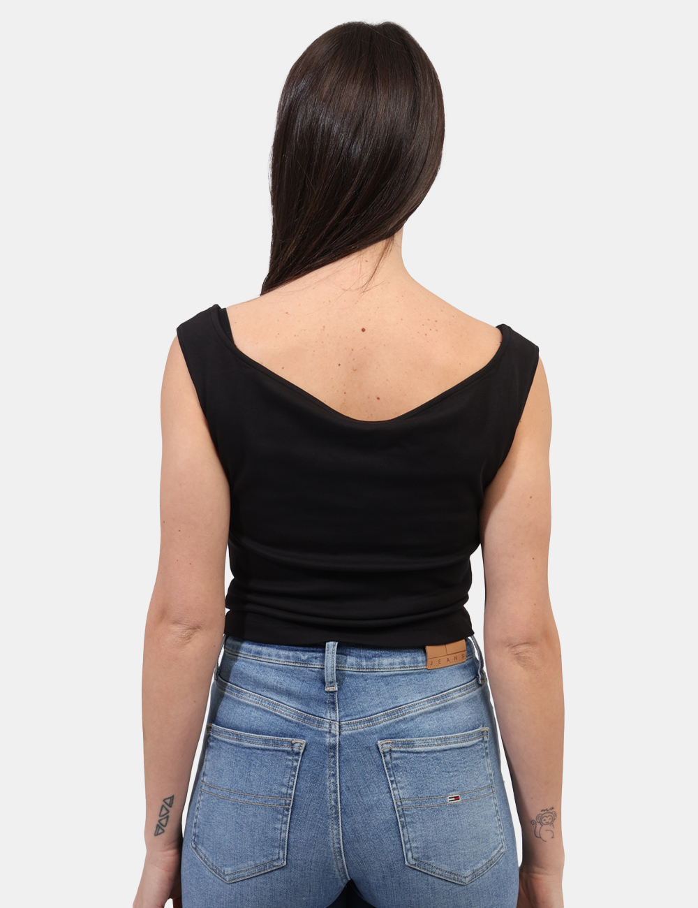 Top corto a spallina larga in total nero. La vestibilità è morbida e regolare. Il top è adatto per occasioni casual/sportive e facilmente combinabile. Troppo comodo per poterne fare a meno.